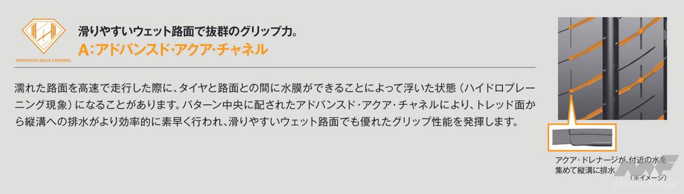 従来モデルから進化したアドバンスド・アクア・チャネルは、タイヤと路面の間の水幕を効率よく、素早く縦溝に排出。ハイドロプレーニングの発生を抑制し、濡れた滑りやすい路面で優れたグリップ力を発揮することで、ウエット・ブレーキング性能と安全性の向上に大きく貢献。