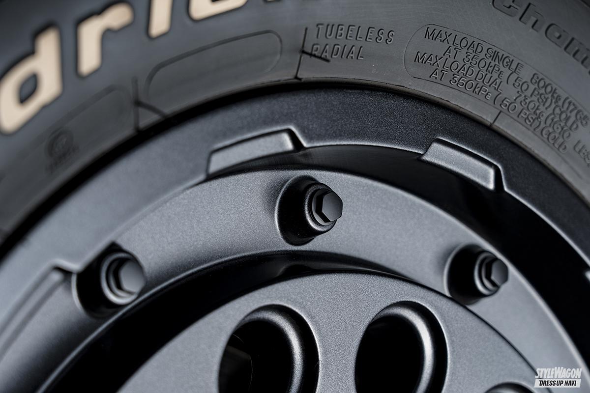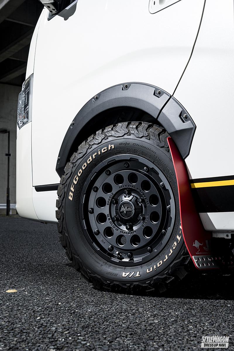 最旬仕様なキャラバンを目指すなら、イチオシなのがオフ系スタイリング。たっぷりの居住空間を持つ素材だから、キャンプ仕様や車中泊仕様で仕上げればまず間違いなく存分に映える。となるとホイールは、土の香り漂う本格オフモデルで。となるのも正解なのだが、ライバルに差を付けるにはもうひとひねり。ラギッドでヘビーデューティーなミリタリー系という選択肢も絶対にアリだ。