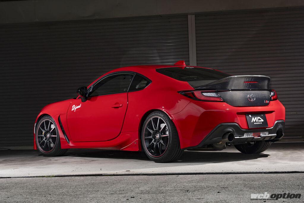今回は、FA24をバランス取りしてポテンシャルを高めたオートサービスカンキのGR86(レッド)に、新サイズの8.5Jをいち早くマッチング。ストリートチューンドとしてのスタイリッシュさを引き立てるため、225サイズで少し引っ張り気味としてみたが、0.5Jのサイズアップで深みが増したセンターパートの奥行き感もあり、頼もしいスピードスタイルへと仕上がった。