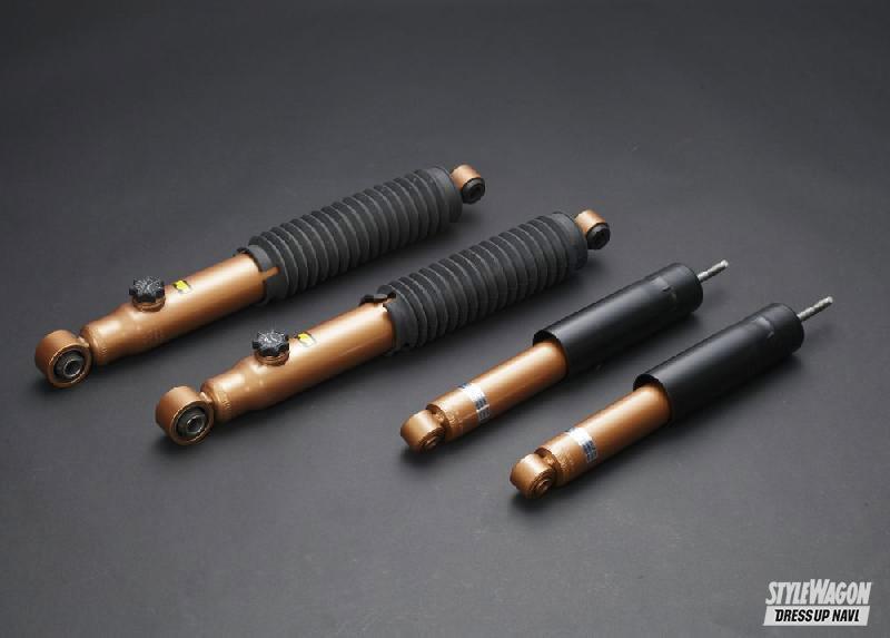ボディライン流に、アゲ風に見せるカスタムが施されたこのBL+Bライトキャンパー。車高が上がって見えるが実は2WD。純正の2WDを4WD同等の車高へと見えるように1インチのリフトアップ(トーションバーにて調整)。さらに厚みが薄いバンプ側のストッパーを(車高ダウン時は逆に肉厚タイプに交換)流用している。サスペンション側はトーションバーの調整+α程度ながら、この車両にはフロント40段、リヤ14段調整式のKYB製となるオリジナルショックが装着されている。