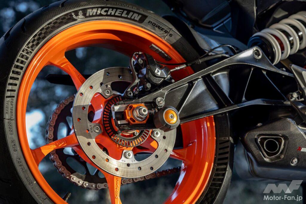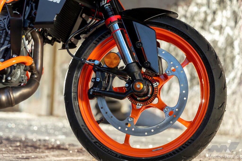 ハンドリングは軽快かつシャープ。従来よりもサスペンションのダンパーが効いている感じで、車体の動きはクイックだが安定している。とりわけ高速コーナーでのビタッとしたスタビリティの高さに感心した。シャーシの剛性強化が効いていると思うが、そういうところにレースを知り尽くしたKTMならではのフィードバックを感じる。