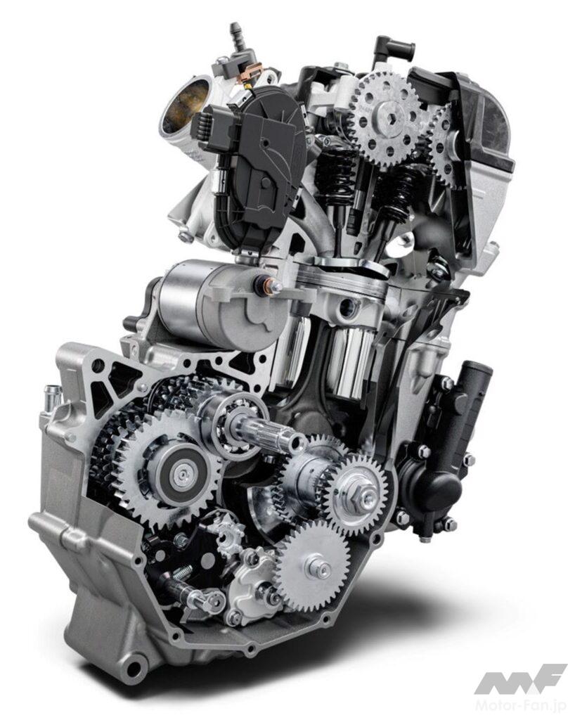 エンジンも次世代型に進化し、軽量でコンパクトな水冷単気筒は従来の375ccから399ccへと排気量を拡大。シリンダーヘッドとギアボックスも新設計となり、最高出力は従来から1ps向上して45psを発揮。同時にEURO 5+にも対応している。