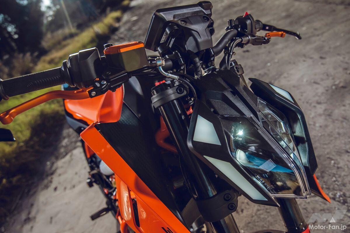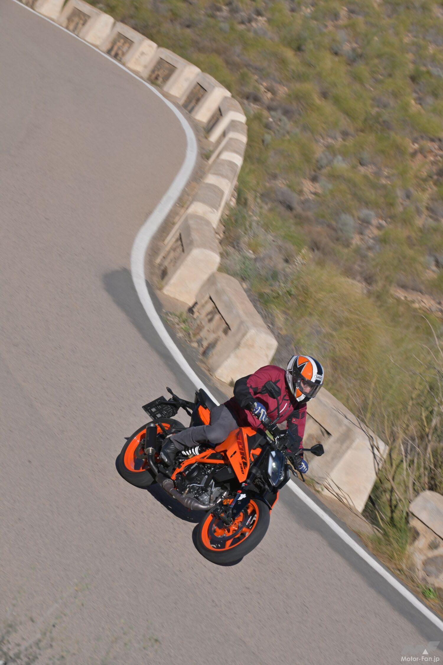 ハンドリングは軽快かつシャープ。従来よりもサスペンションのダンパーが効いている感じで、車体の動きはクイックだが安定している。とりわけ高速コーナーでのビタッとしたスタビリティの高さに感心した。シャーシの剛性強化が効いていると思うが、そういうところにレースを知り尽くしたKTMならではのフィードバックを感じる。