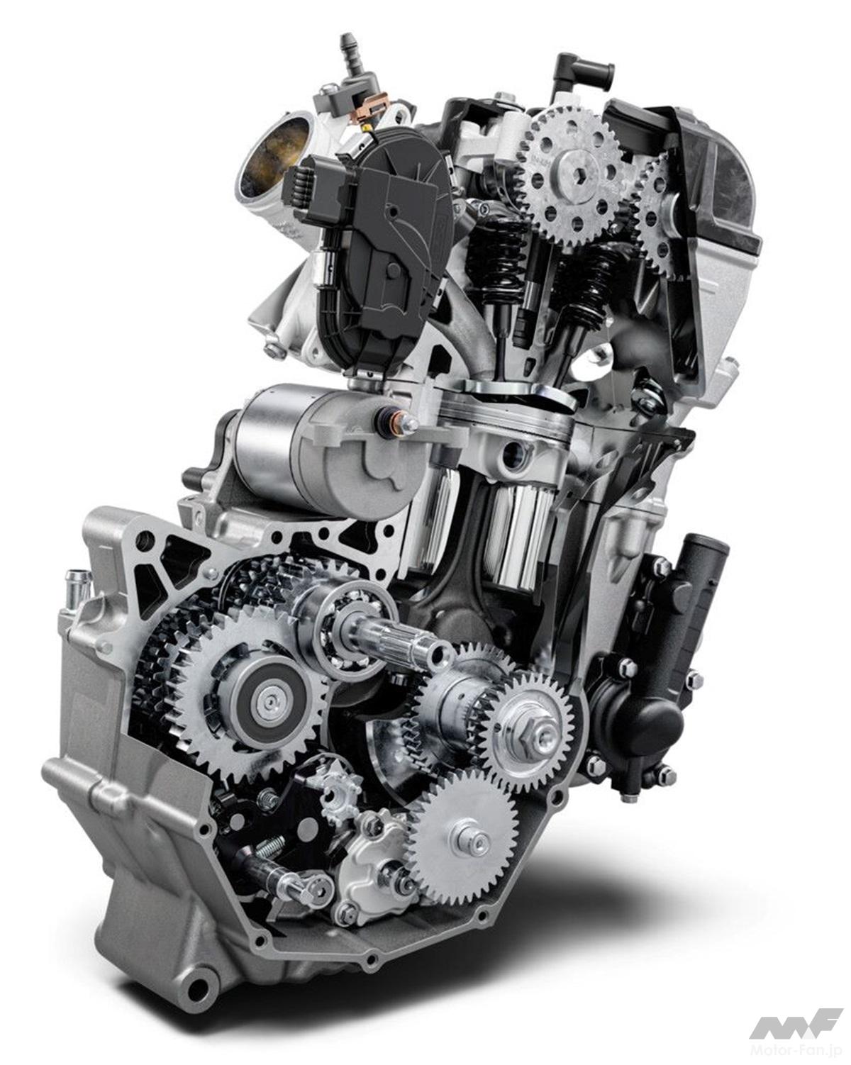 エンジンも次世代型に進化し、軽量でコンパクトな水冷単気筒は従来の375ccから399ccへと排気量を拡大。シリンダーヘッドとギアボックスも新設計となり、最高出力は従来から1ps向上して45psを発揮。同時にEURO 5+にも対応している。