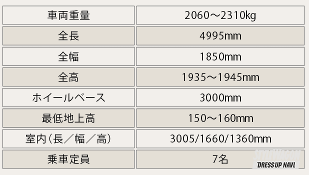 車重は装備の違いなどで同じハイブリッド車でも約20kgほどヴェルファイアいが重い。外観のサイズスペックは30系後期とほぼ変わらず。全長+5mmくらいの違いだ。室内サイズは、長さ約200mm、幅約70mm、高さ約40mmほど小さくなっているが、座ってその差がわかるほどのものではない。注意すべきは現状7人乗りだけ。2列目ベンチシートの8人乗りは設定なし。