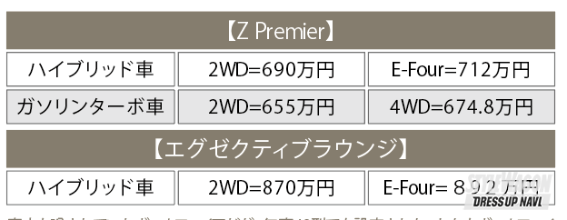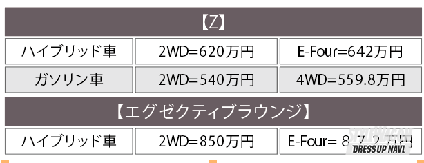 最安でZ/2WDの540万円。30系と比べると同等グレードのSCパケが約470万円〜だったことを考えると、かなり割高。実質かなりの値上げとなっているが、30系ではオプションだった装備が標準だったことを考えると、約40〜50万円くらいの値上げと考えられる。近年の半導体不足や材料費高騰などもこの価格設定の要因と言えるだろう。