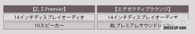 ディスプレイオーディオは、全車標準で14インチの大画面ディスプレイ。エグゼクティブのみJBLプレミアムサウンドとなる。リアのフリップダウンモニターはエグゼクティブが標準。ZとZプレミアはディーラーオプションとなる。