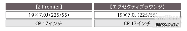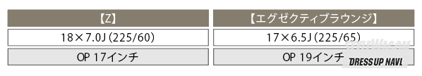 Zは18インチが標準。オプションで17インチ(-5.5万円)が選べる。エグゼクティブは+3.3万円のオプションで19インチにできる。