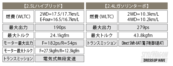 ハイブリッド車は最新エンジン「A25A-FXS」を搭載。スペックはアルファードと同じ。30系V6の代わりとも言える直4の2.4Lターボエンジンは、V6が300ps/36.8kgfmだったので、数値的には馬力が落ちているがトルクはアップ。走り始めなどこの高トルクはV6にもヒケを取らないはずと期待大。