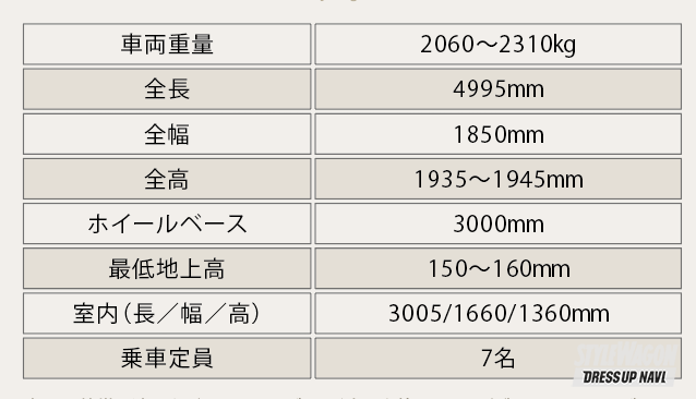 車重は装備の違いなどで同じハイブリッド車でも約20kgほどヴェルファイアいが重い。外観のサイズスペックは30系後期とほぼ変わらず。全長+5mmくらいの違いだ。室内サイズは、長さ約200mm、幅約70mm、高さ約40mmほど小さくなっているが、座ってその差がわかるほどのものではない。注意すべきは現状7人乗りだけ。2列目ベンチシートの8人乗りは設定なし。