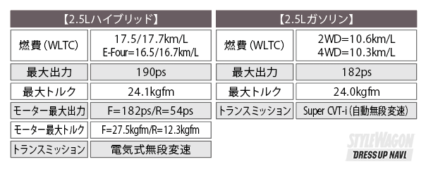 2.5Lハイブリッド車は、トヨタの最新型エンジン「A25A-FXS」を搭載。高出力と燃費向上を図った。ヴェルファイアの2.4Lガソリンターボが注目されがちだが、ハイブリッド車のパフォーマンスアップも見逃せないポイント。2.5Lガソリン車は30系からの継続で「2AR-FE」が搭載される。数値的には見ると30系と変わらず。