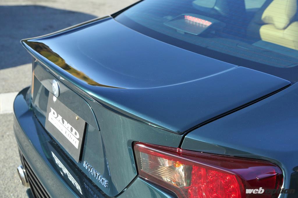 純正と同サイズながらダクト風の大胆なデザインを与え、ガラリと意匠変更を行ったリヤバンパー。あえて専用マフラーを設定せず、純正マフラーにも対応する。トランクスポイラーは立体的な造形を取り入れる。トランク全体を覆うカバー形状とすることで、後付け感を払拭しているのもポイント。