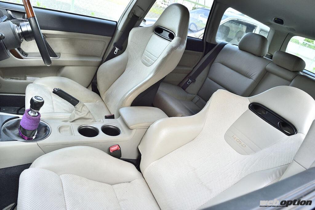 内装はベージュレザーで統一。左右シートも張り替え済みのレカロを組み合わせることで、統一感溢れるインテリアを構築している。最近はオーディオ系イベントにも興味が出てきたそうで、今後は音響環境にも手を入れていく予定だ。