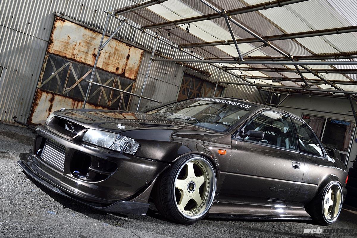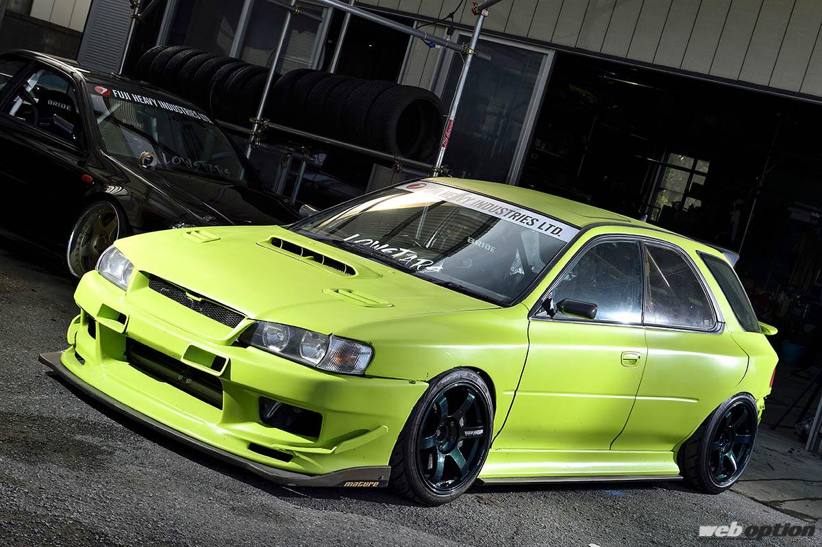 10万円で手に入れた不動状態の初代レガシィをベースに製作。エンジンはGC8バージョン3に搭載されていたEJ20で、ミッションもGDBの6速MTを移植。フロントマスクは北米仕様、リヤは欧州仕様化するなど細部まで拘りが詰まったFRドリフトスペックだ。