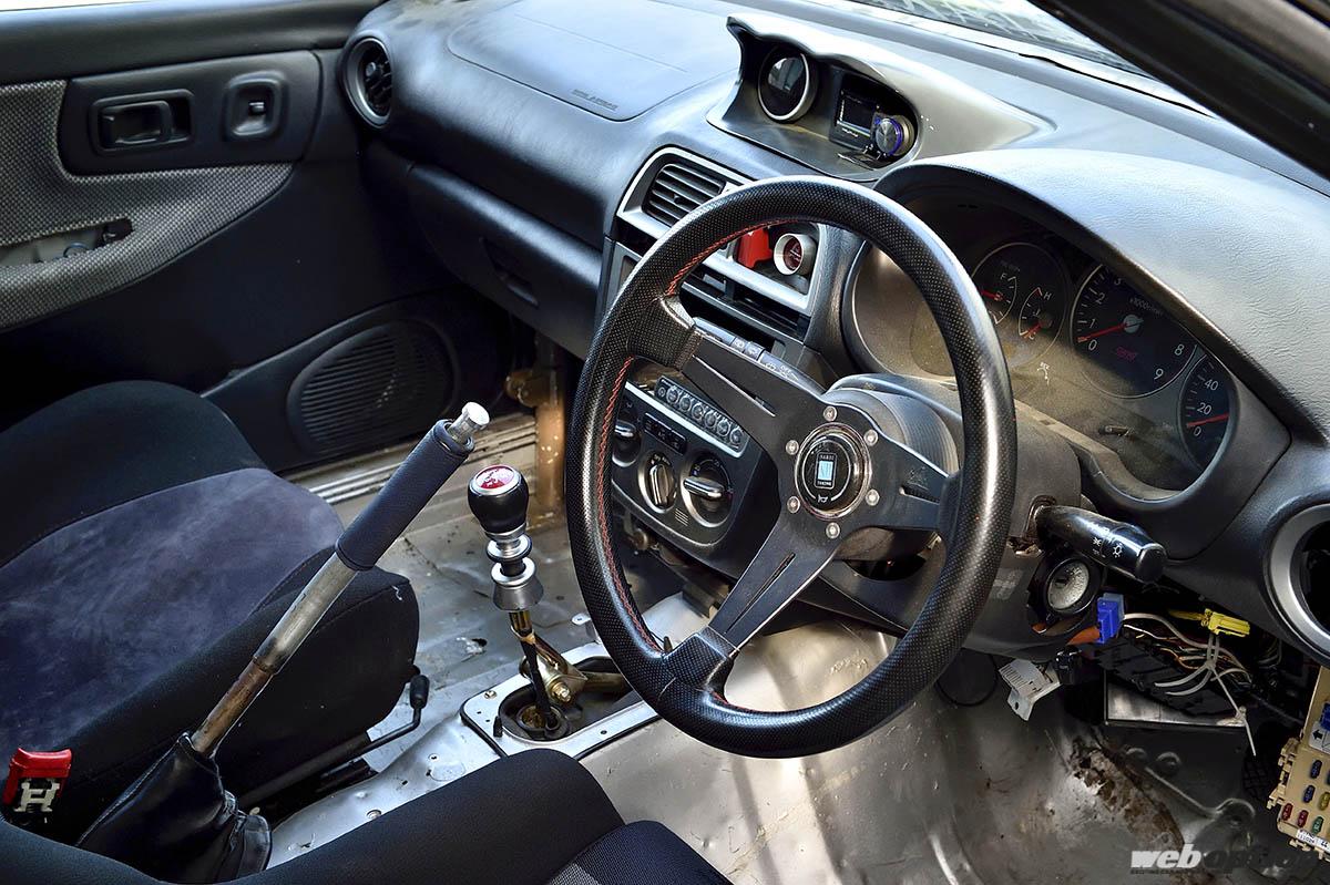 ダッシュボードやメーター類もGDB用をごっそりと移植。「当てがってみたら着いたので(笑)」とは三浦さん。ナンバーレスのサーキット仕様ということで、リヤはシートレスのドンガラ仕様となる。