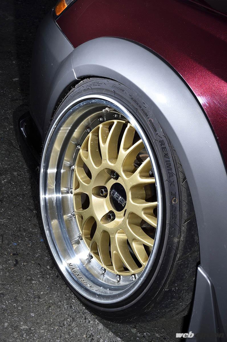 足元に輝くのは超希少なBBSのレーシングGT-II。リムステッカー通りの鍛造マグネシウムモデルで、ホイールマニア垂涎の逸品だ。なお、コレクションの中で唯一のマルチリンク車で、日産系のハブが小加工で取り付けられたという。