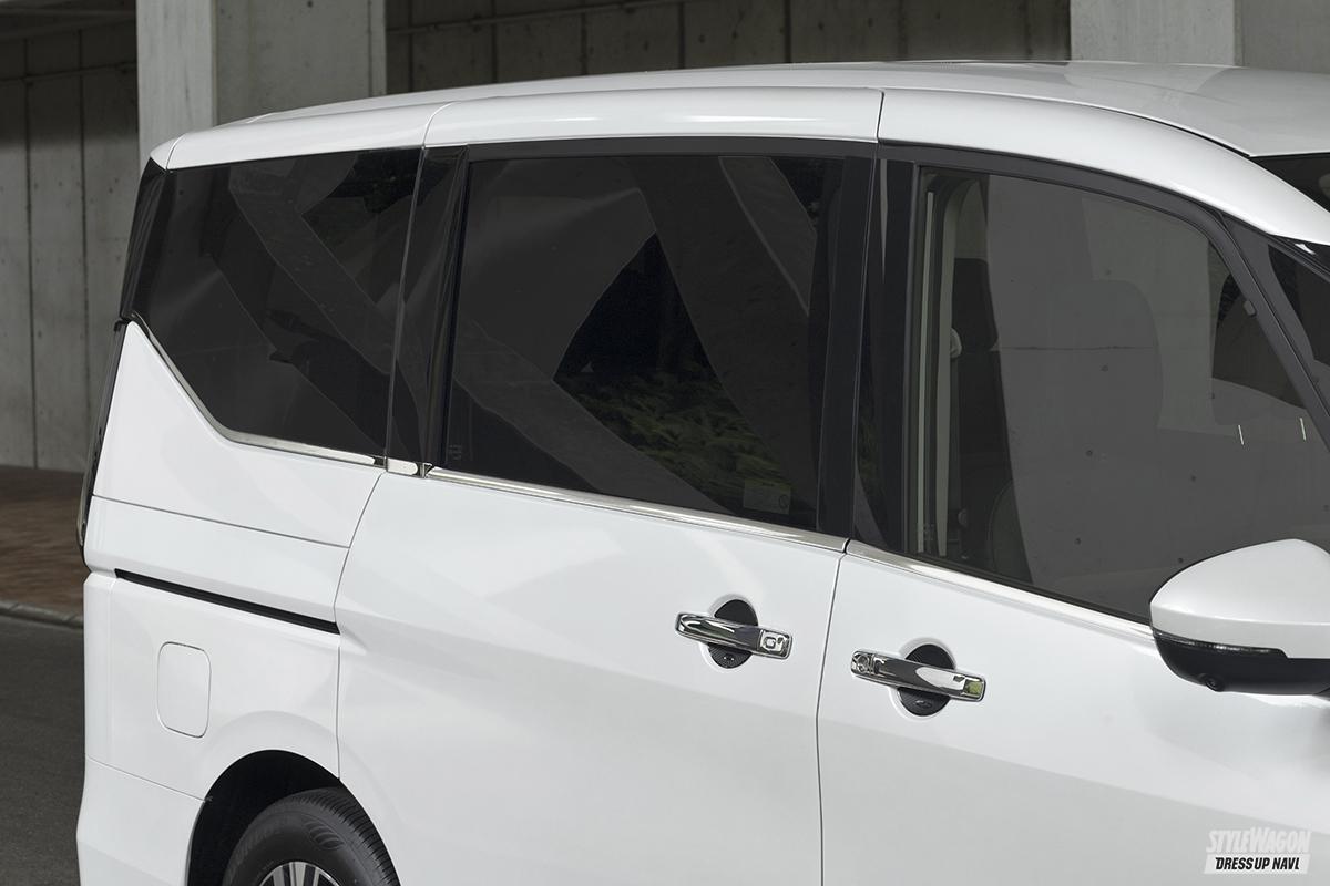 クロームメッキの輝きがサイドウインドウ下段のラインを引き締めるウエザーストリップモール。ピラーカバーはピアノブラック仕上げ。