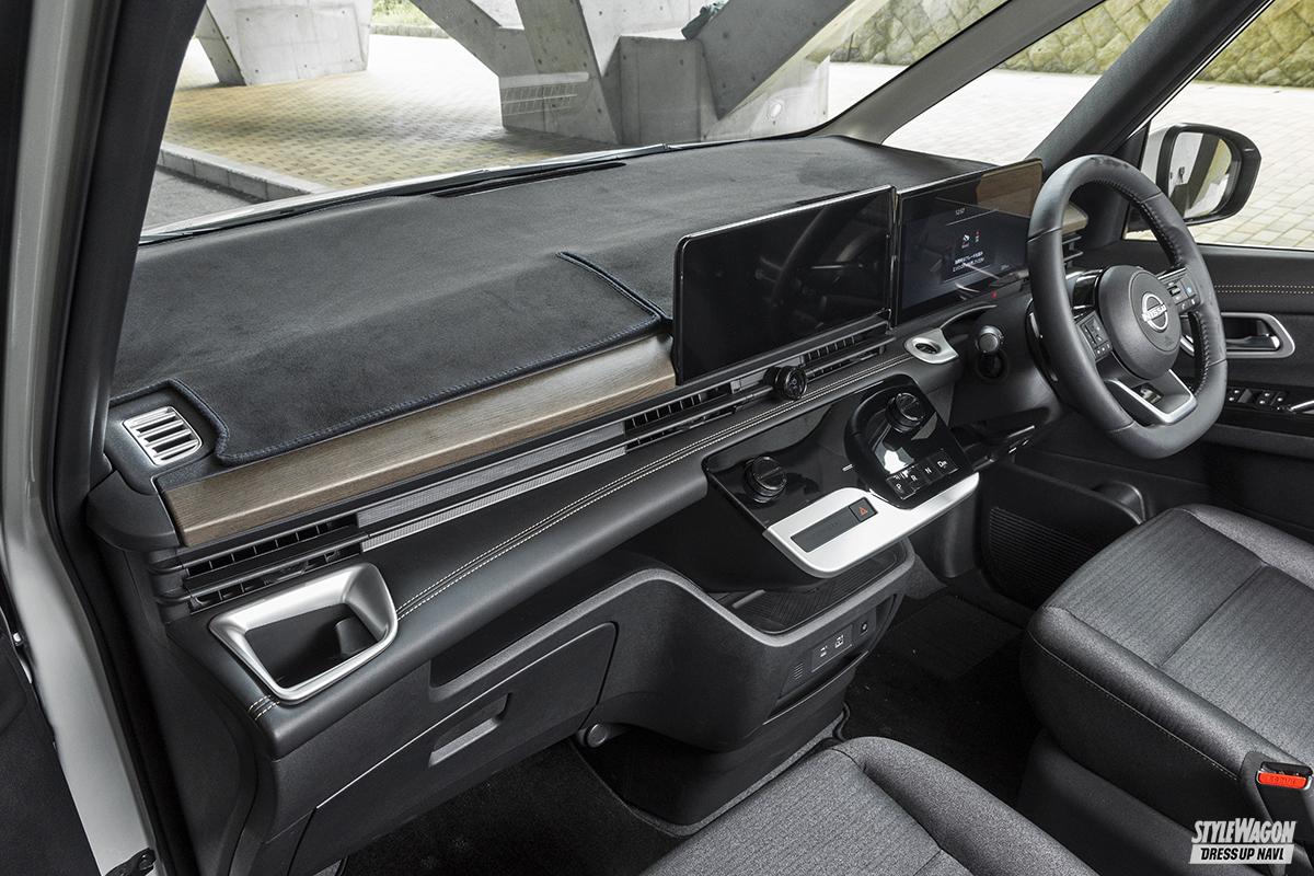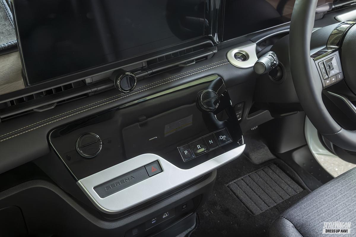 C28セレナの特徴でもあるスイッチ式シフトのパネル周囲を縁取るシフトノブカバーとエンジンスタートスイッチ部分のトリム。いずれも近日発売予定。