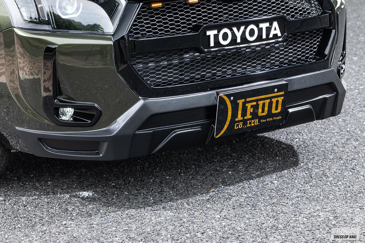強烈なインパクトを放つのはフェイスまわり。タコマをイメージしたバンパーはグリルまでが一体式で、量感あるボンネットフードも付属。グリルマーカーにイカリング仕様のヘッドライト、IPF公認のオリジナルステーで搭載したルーフLEDライトバーなど見どころ満載だ。