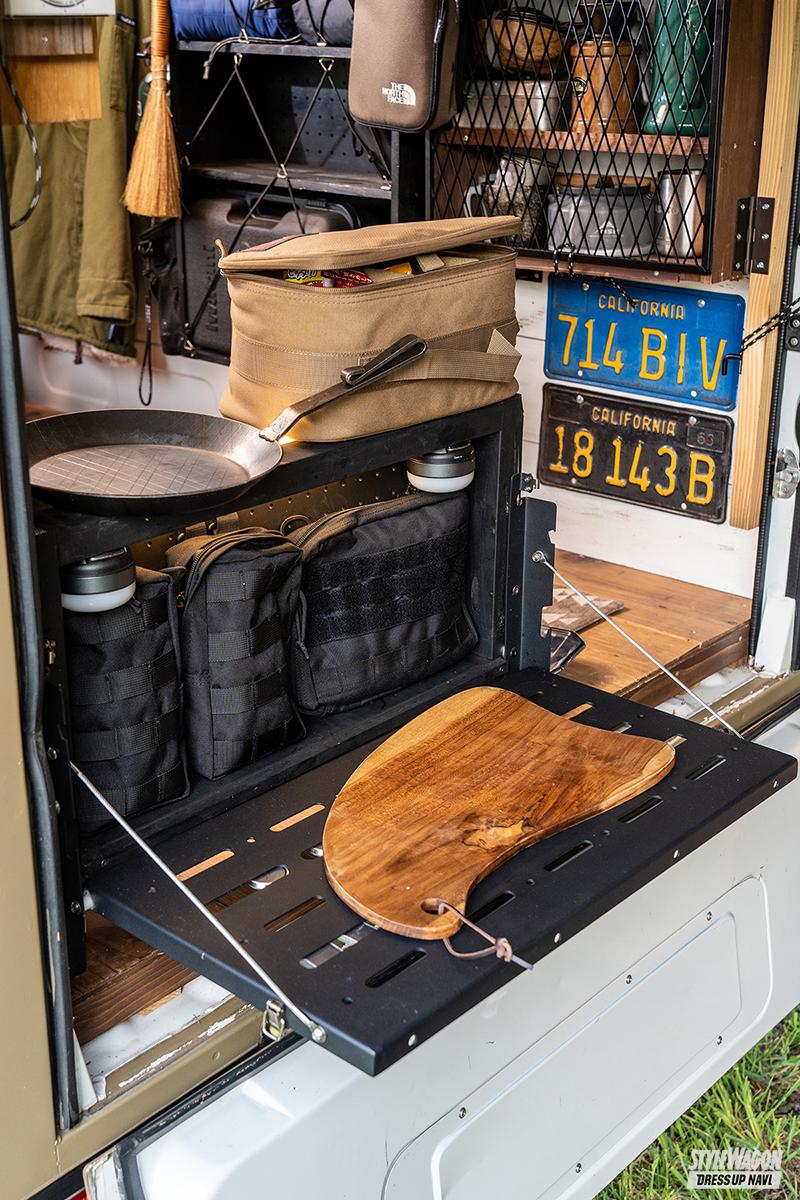 そんな普段目にするパネルバンは真っ白だったり赤と白のツートンだったりするけれど、本日の主役はオーナーのスモールベースキャンプさんがペンキとローラーで塗り上げたアースカラー仕様。これまたDIYで仕立て上げられたウッディーなキャビンと共に内外装ともに映える最高のソロキャン・ベースカーと化している。