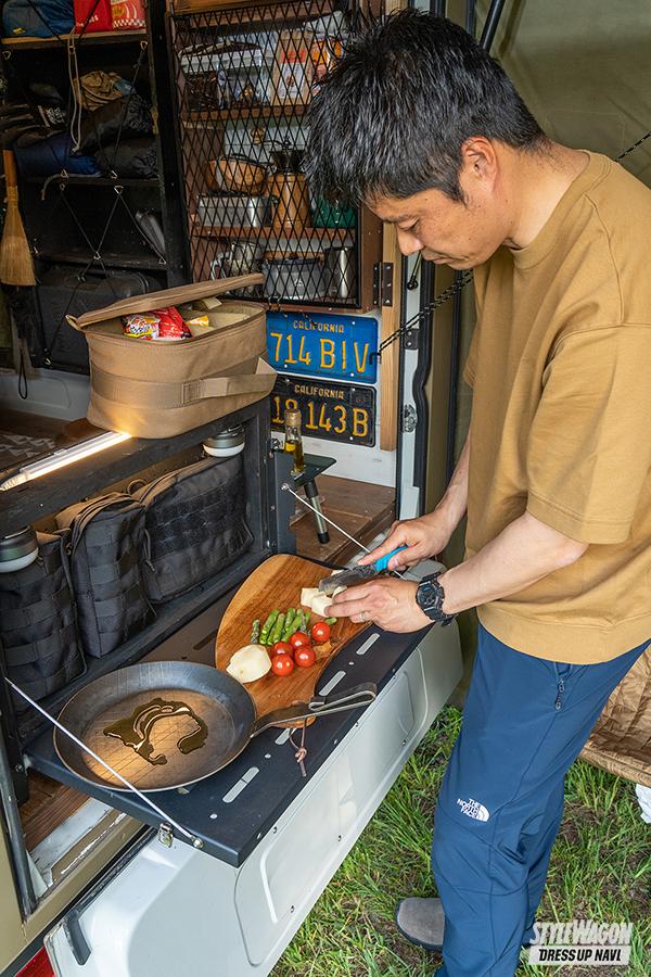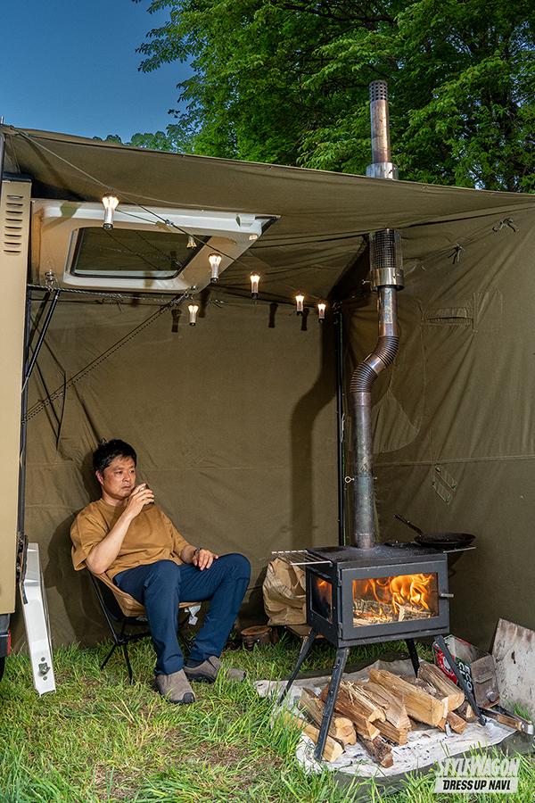 ポイントはクルマと一体化させて設営する軍幕テントと薪ストープの組み合わせで、そのコンパクトかつ機能性にあふれたパッケージングが注目の的。日中はストーブで暖の取れた軍幕テントで飲んだり食べたりを楽しみ、就寝時は自分好みに仕立て上げた車内で車中泊。控え目に言って最高じゃないですか。