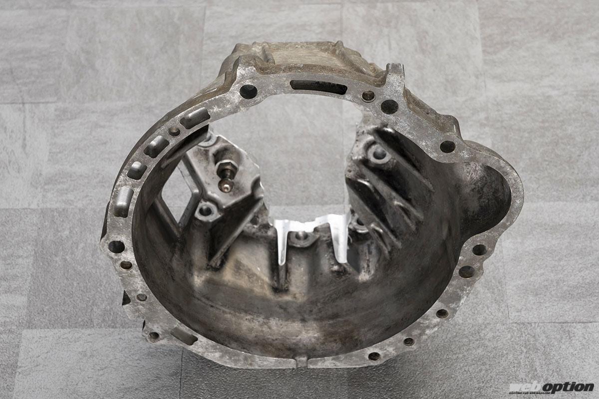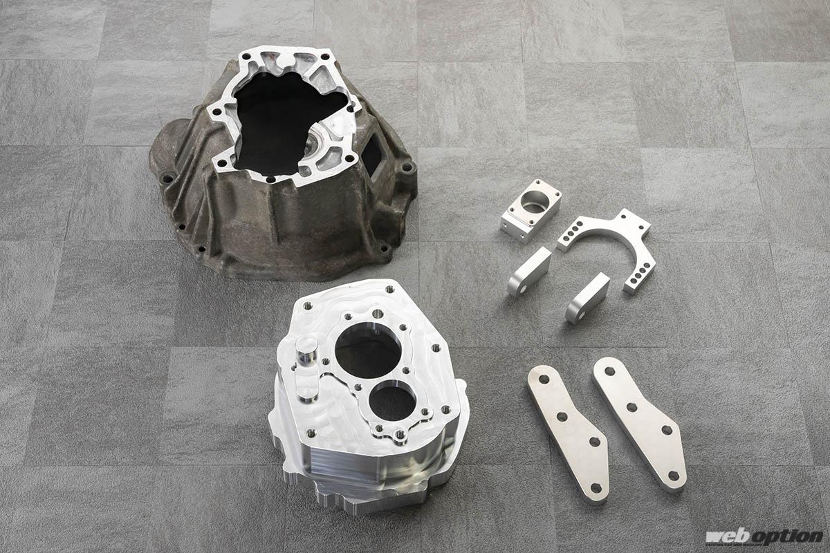 キットの詳細を見ていく。大幅なフロア加工やエンジン搭載位置の変更を施さずに6速MT化できるよう、ベルハウジングはAE86純正を加工流用。レリーズベアリングやレリーズフォークも変えることなく6速MTが搭載可能だが、スプライン径は変わるためクラッチディスク変更が必要だ。