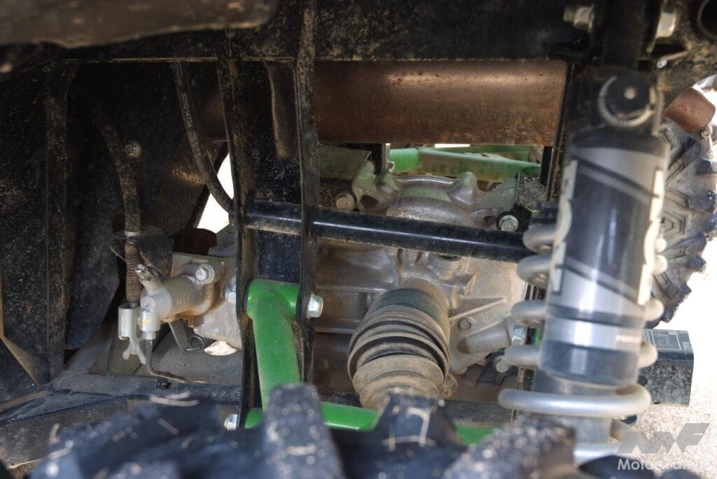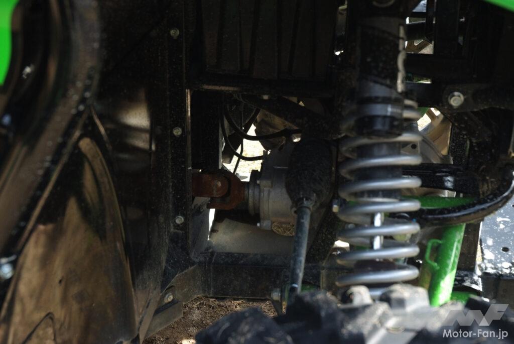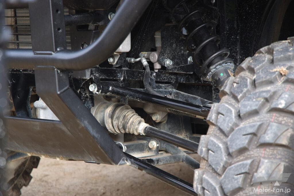 とはいえフロントサスペンションの上下アームはKRX 1000よりは細く、スプリングとショックアブソーバーもそこまでは長くない。それでもショックアブソーバーは別タンク式となっており、調整機構も備えスポーティな走行も視野に入れている。