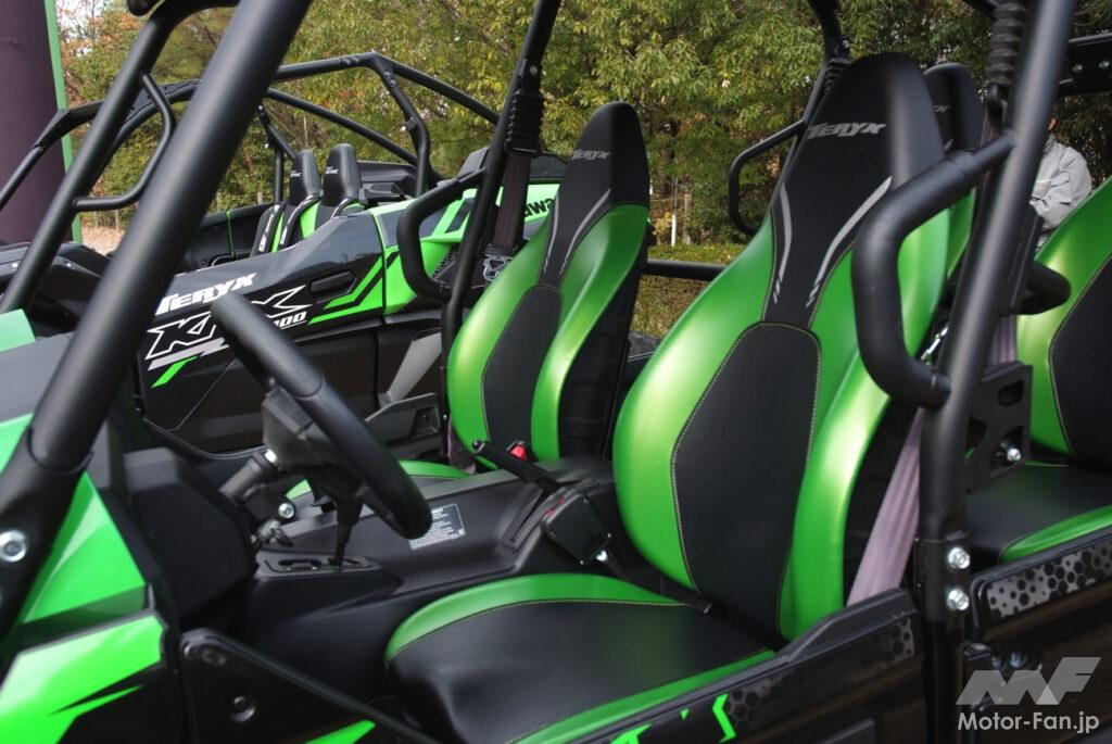 4名乗車用に4座の独立したセミバケットシートを設置。フロントシートは前後スライドが可能になっている。KRX 1000と異なりシートベルトは全席で一般的な3点式を採用する。
