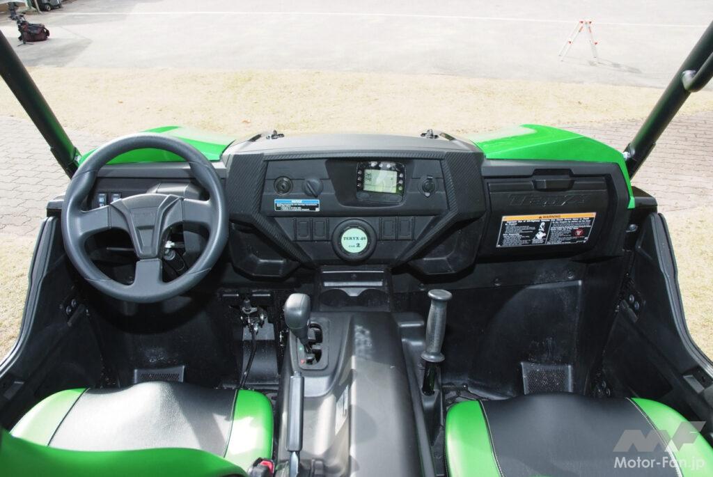 しかし今回、カワサキモータースジャパンが正規販売するのは、ハンドルとペダルを備え複数名乗車が可能な”クルマ”で、アメリカを中心に人気の小型”オフロードバギー”だ。