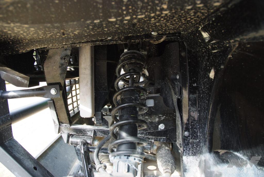 サスペンションは前後のアッパー、ロワ共にAアームのダブルウィッシュボーン形式で、リヤのアッパーアームのみ角断面になっている。ショックユニットは前後ともアッパーアームに接続され、ショックアブソーバーは調整機構を持たないシンプルで実用性に重きをおいた構成だ。