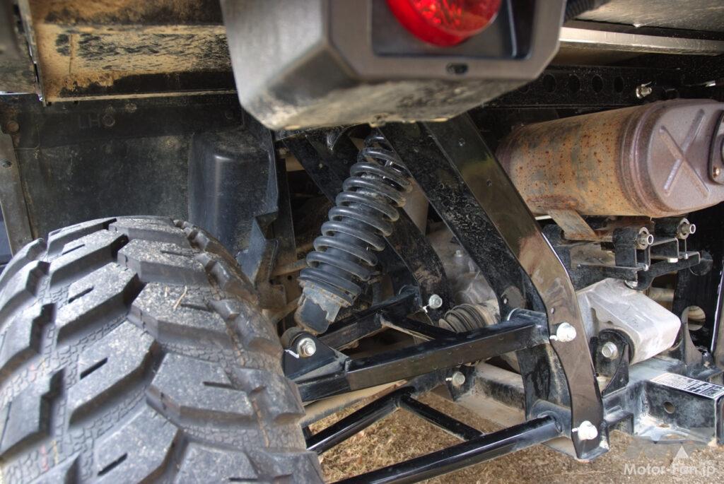 4名乗車や荷物の積載を考慮しているのか、リヤサスペンションはウィッシュボーンのアーム、下側は特に太く作られている。同じダブルウィッシュボーン形式ではあるが、フロントではアッパーアームに接続したショックユニットをリヤではアッパーアームを避けてロワアームに接続される。調整機構付きの別タンク式ショックアブソーバーを装着するのはフロント同様だ。