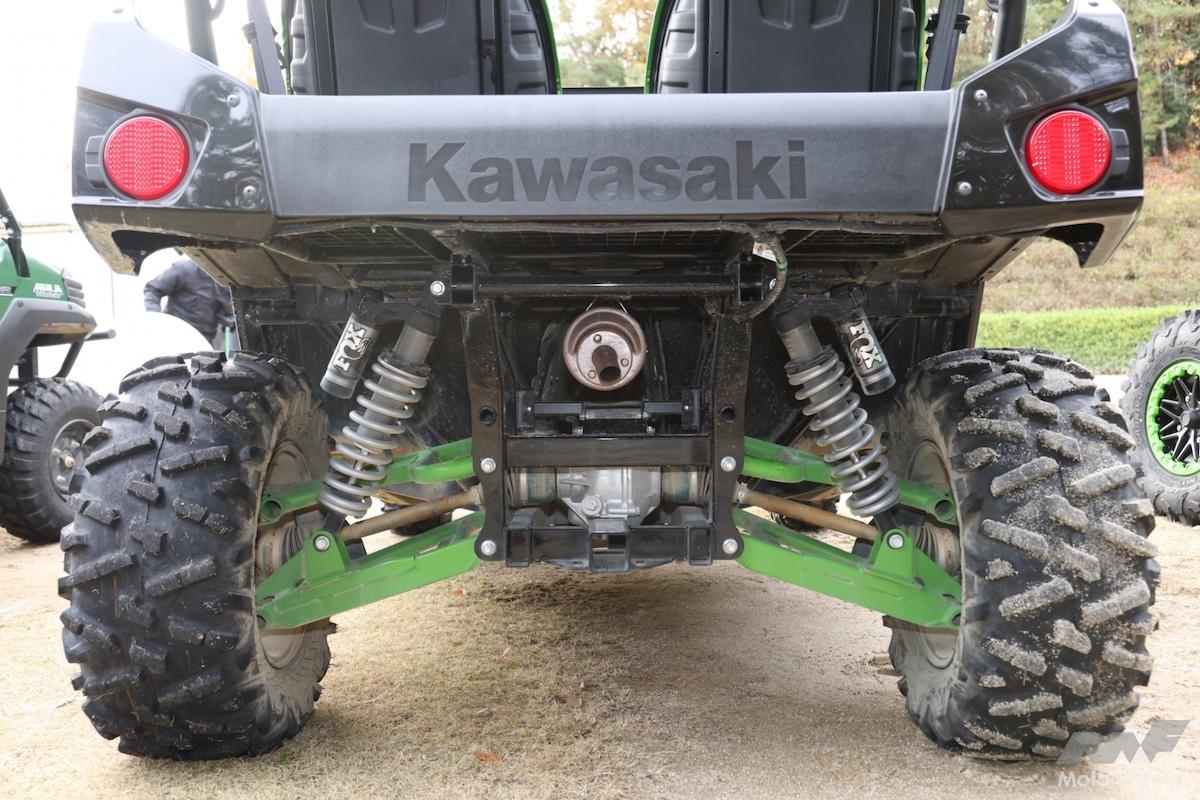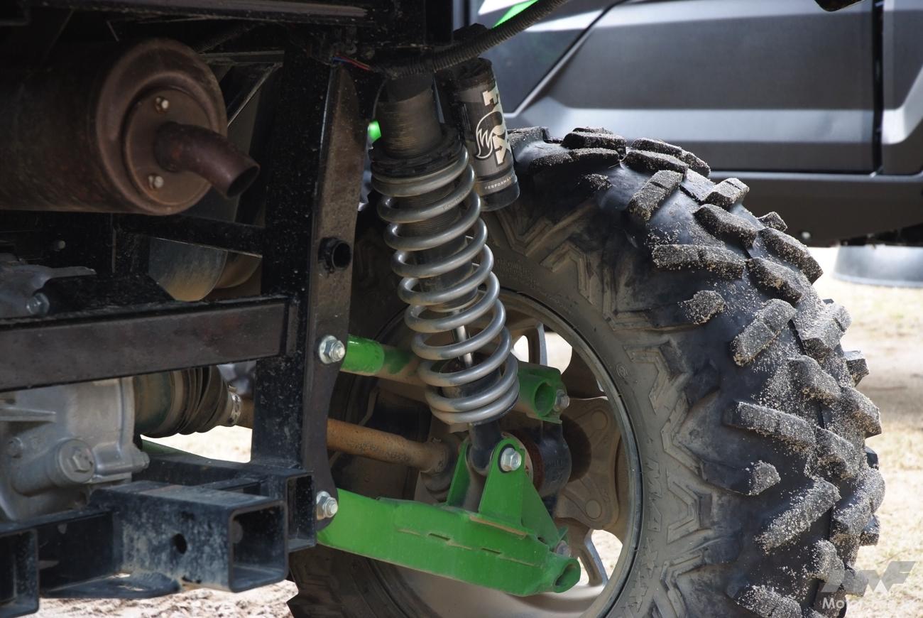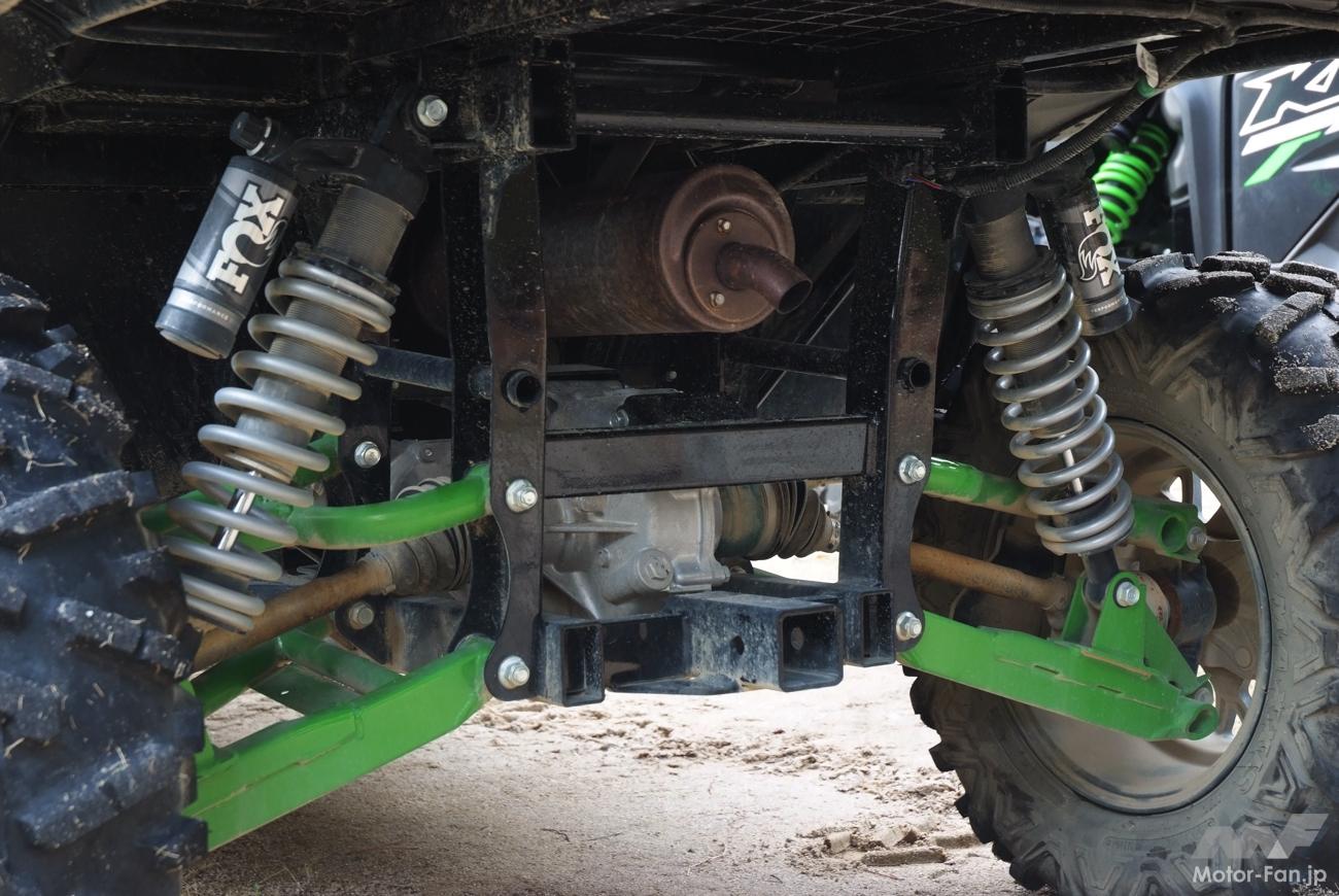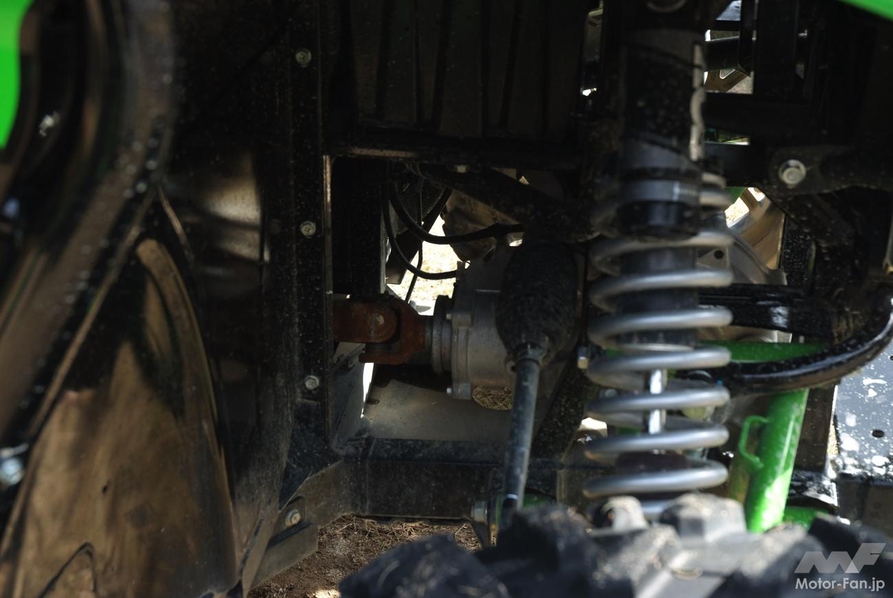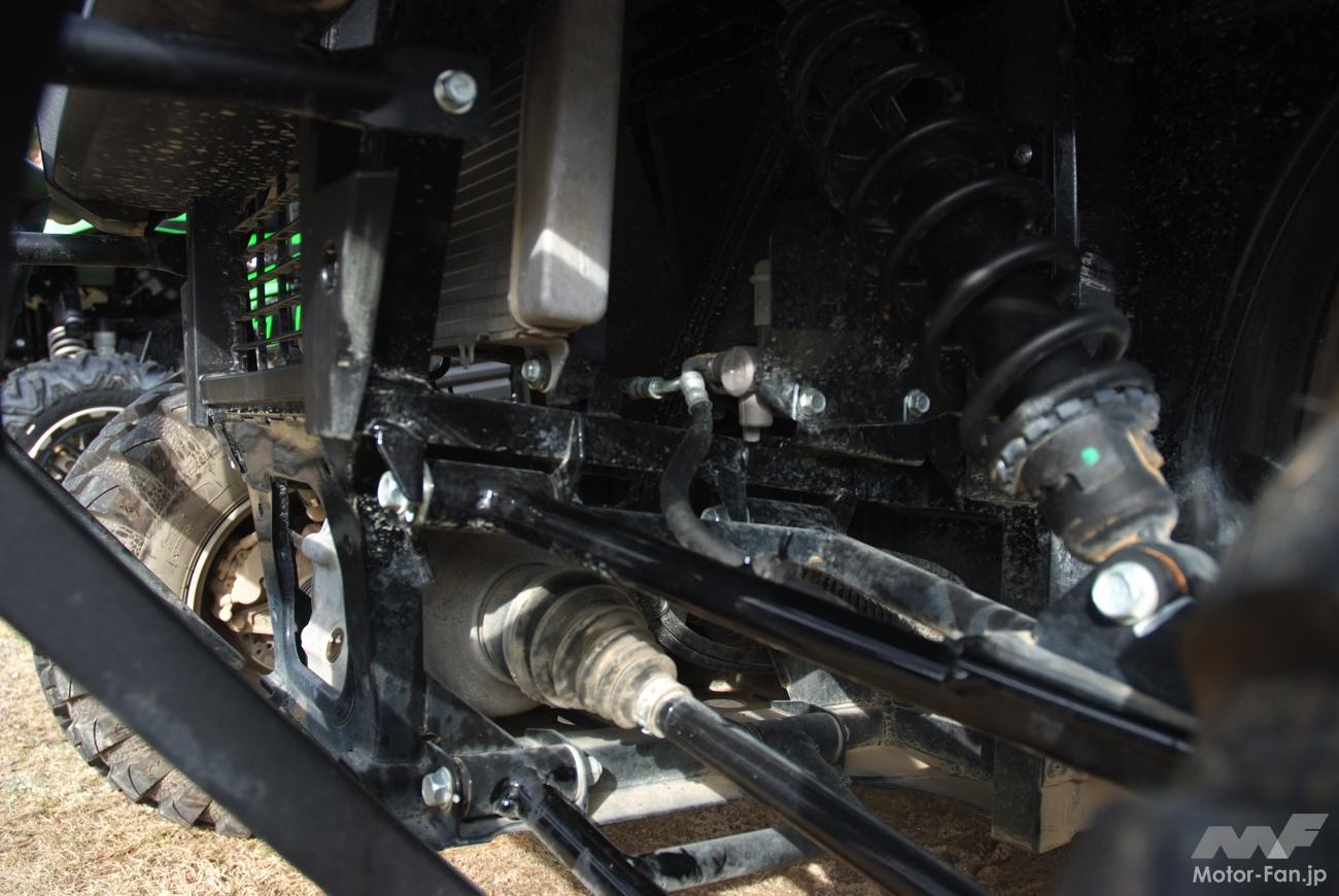 とはいえフロントサスペンションの上下アームはKRX 1000よりは細く、スプリングとショックアブソーバーもそこまでは長くない。それでもショックアブソーバーは別タンク式となっており、調整機構も備えスポーティな走行も視野に入れている。