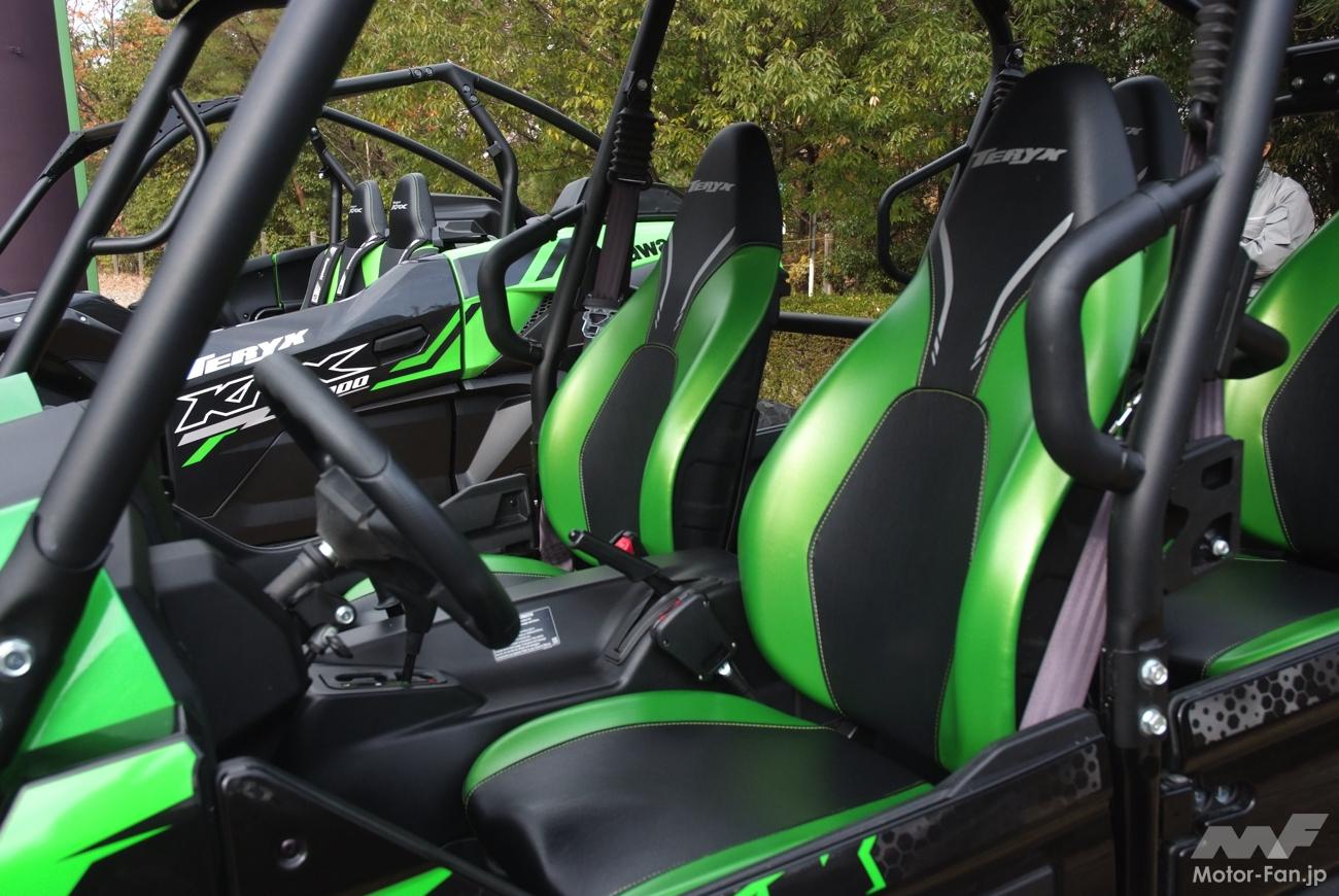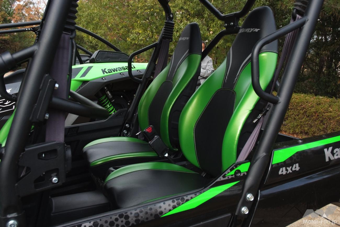 4名乗車用に4座の独立したセミバケットシートを設置。フロントシートは前後スライドが可能になっている。KRX 1000と異なりシートベルトは全席で一般的な3点式を採用する。