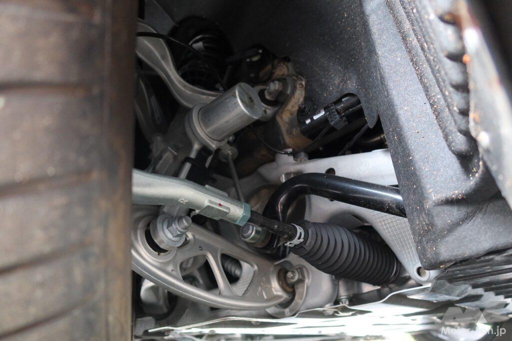メルセデスは「ホイールをコントロールする部分とサスペンション機能を受け持つ部分を相互に独立させることで、高い横加速度を可能としつつ、ステアリングシステムに対する駆動力の影響を最小限に抑えている」と説明している。アッパーのAアームを2本のリンクに分割することで、ナックル側ピボットが受け持つ軸の機能をストロークと転舵で分離したということだろう(特別なことは言ってないし、ハイマウントタイプのマルチリンクでも対応可)。ナックル、ハブキャリア、各種リンクはすべて鍛造アルミ製だ。