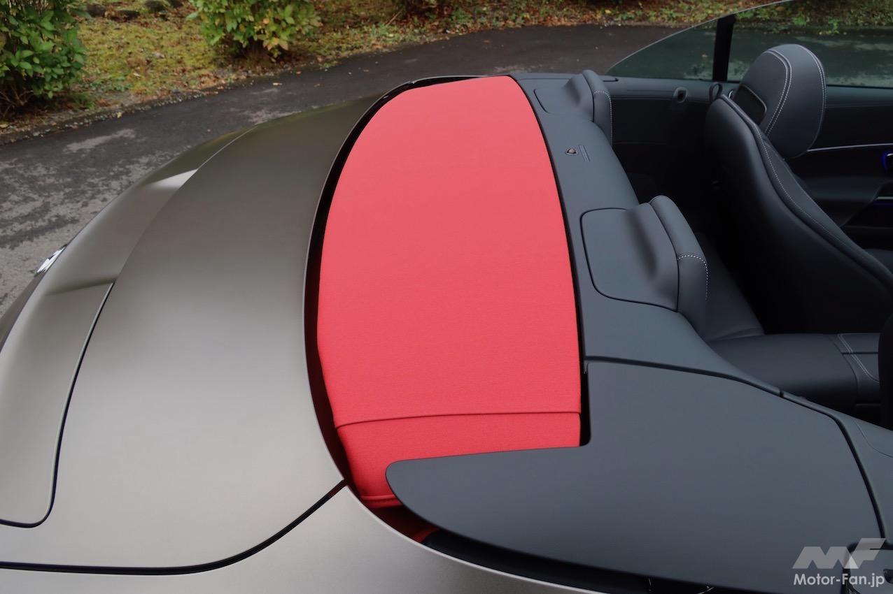 ソフトトップの開閉操作はセンターコンソールのスイッチパネル、もしくは11.9インチサイズの縦型メディアディスプレイをタッチして行なう。開閉は約15秒で完了。60km/hまでであれば走行中でも開閉が可能だ。Z形に折りたたまれるソフトトップを完全に収納した際は周囲の面より突出せず、きれいに収納される。見た目にも極めてスマートだ。前席左右ともシートヒーター機能を含むシートベンチレーターを標準で装備するし、首元に温風を吹きつけるエアスカーフも標準装備。オールシーズンで快適なドライブが楽しめそうだ。クローズドにしたときの静粛性は高く、迫力あるエンジンサウンド(詳細は後述)を楽しむのに向いている。