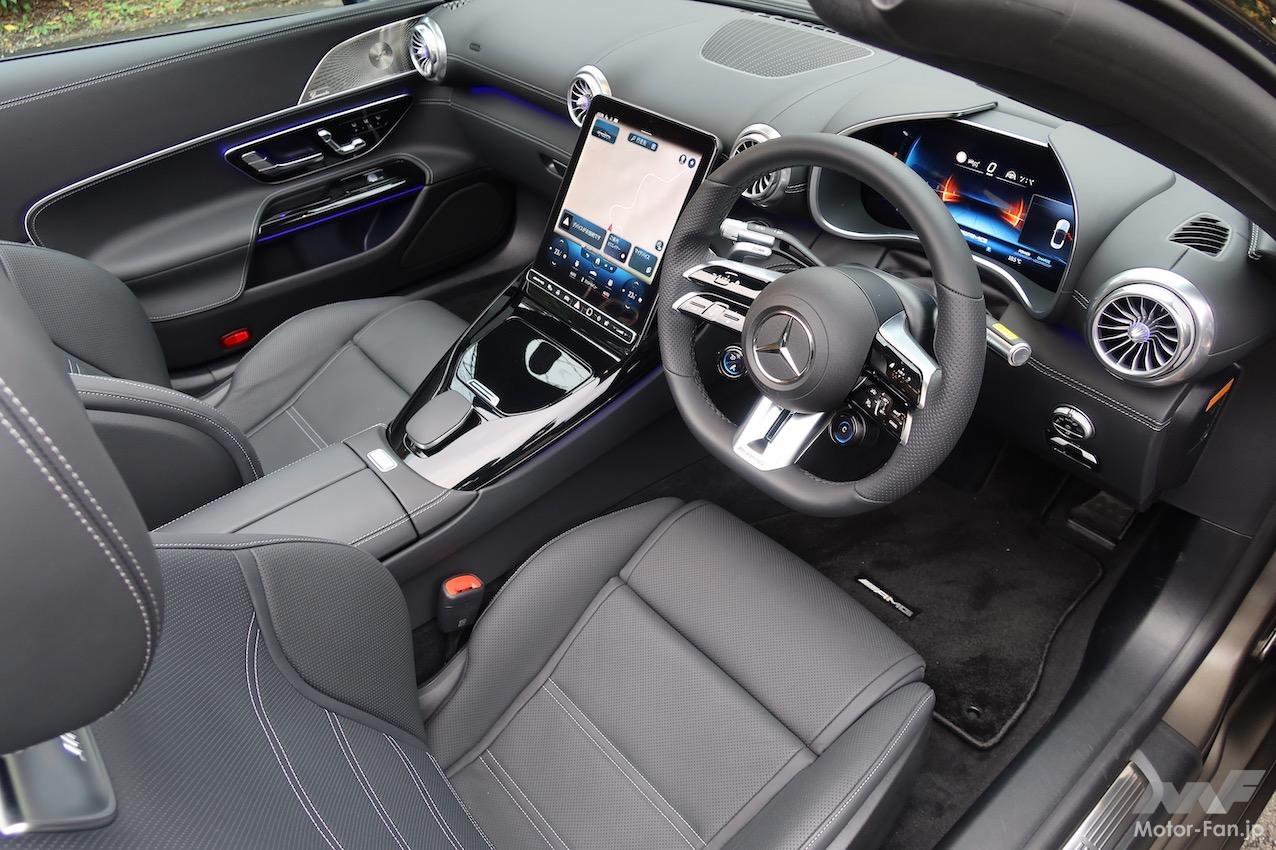 ソフトトップの開閉操作はセンターコンソールのスイッチパネル、もしくは11.9インチサイズの縦型メディアディスプレイをタッチして行なう。開閉は約15秒で完了。60km/hまでであれば走行中でも開閉が可能だ。Z形に折りたたまれるソフトトップを完全に収納した際は周囲の面より突出せず、きれいに収納される。見た目にも極めてスマートだ。前席左右ともシートヒーター機能を含むシートベンチレーターを標準で装備するし、首元に温風を吹きつけるエアスカーフも標準装備。オールシーズンで快適なドライブが楽しめそうだ。クローズドにしたときの静粛性は高く、迫力あるエンジンサウンド(詳細は後述)を楽しむのに向いている。