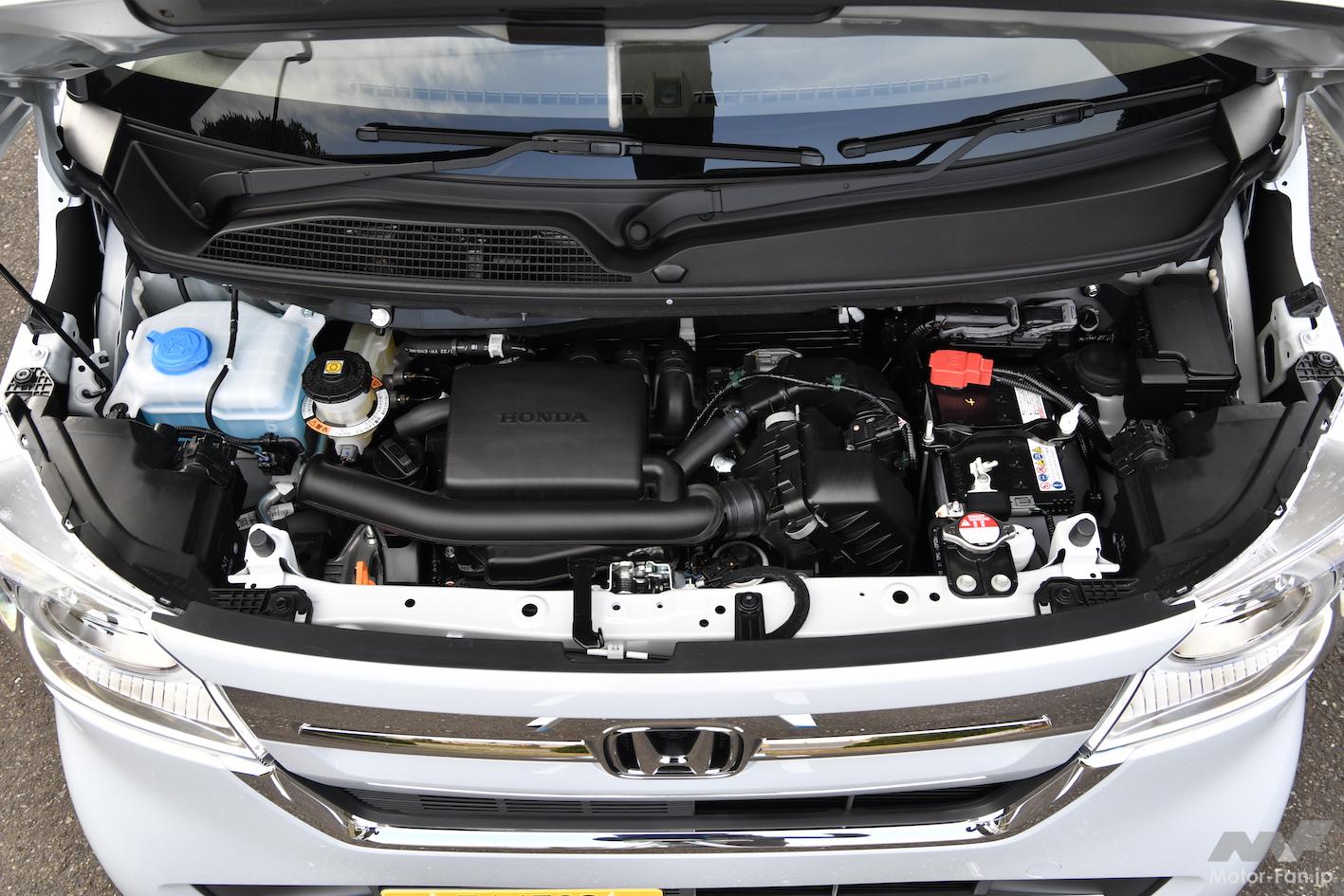 メカニズム面でも、登録車もビックリな最新機構を満載。エンジンにはストローク×ボア比が1.29に達する超ロングストロークの「S07B型」を搭載する。ロングストローク化すればボア径が小さくなり、吸気バルブ面積が減ってパワーが出ない理屈だが、そこはホンダの“伝家の宝刀”Lo-Hi切り替えVTEC機構を採用。自然吸気エンジンの最高出力43kW/最大トルク65Nmは軽自動車最強。それでいてカタログ燃費も20.0km/Lを越える!