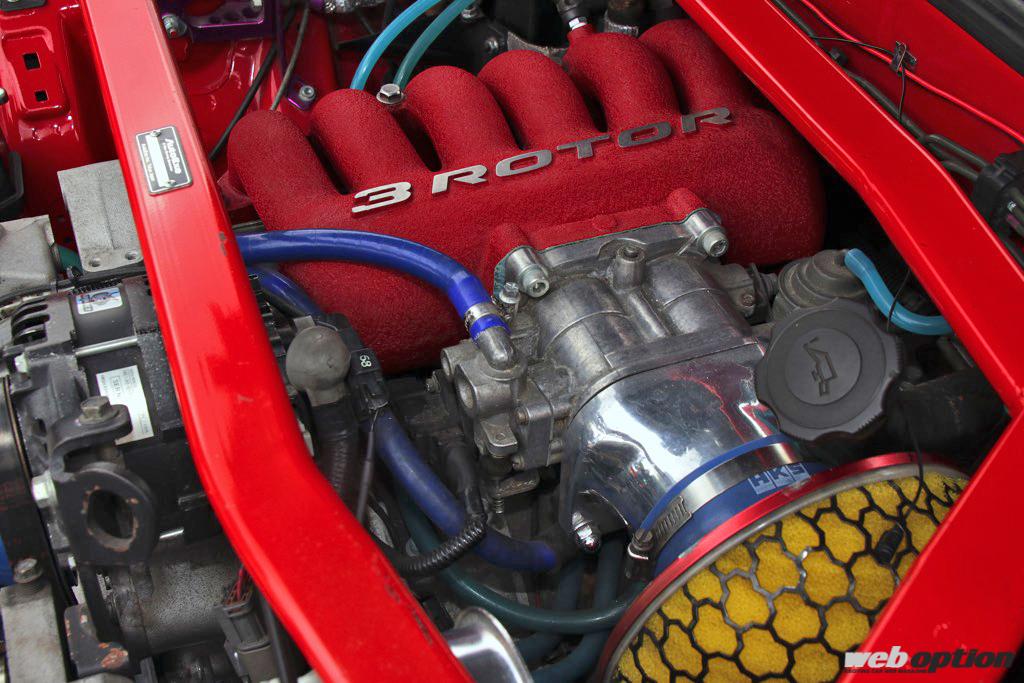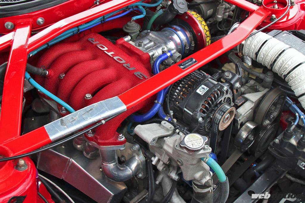 20BエンジンはRX-8の10.0高圧縮ローターを組み込んだサイドポート仕様。インマニやEXマニはRSパンテーラオリジナルで、ウォーターポンプやパワステなどベルト駆動の補機類はFD3S用となっている。最高出力は336psでレブリミットは9000rpm、常用は7500~8000rpmとしている。完成してから5年以上経過しているが、トラブルは皆無とのことだ。
