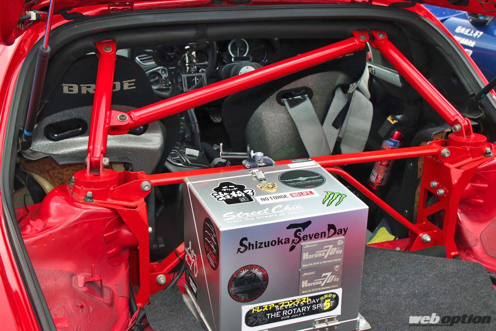 レッドに塗装された11点式ロールケージが存在感を主張するリヤセクション。オートエクゼ製のタワーブレース後方に設置されたボックス内には、エンジンルームから移設されたバッテリーが仕込まれている。
