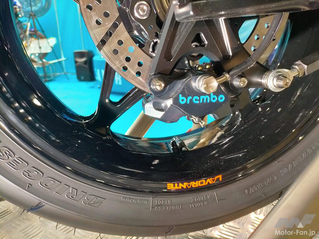 前後ホイールは機動性の向上を目指し、フロントはノーマルの19インチから17インチ、リアは18インチから17インチに小径化。ホイールのリム幅拡大により、フロントタイヤは3.25-19→120/70-17 リアタイヤは4.00-18→200/55-17へと大幅にワイド化。