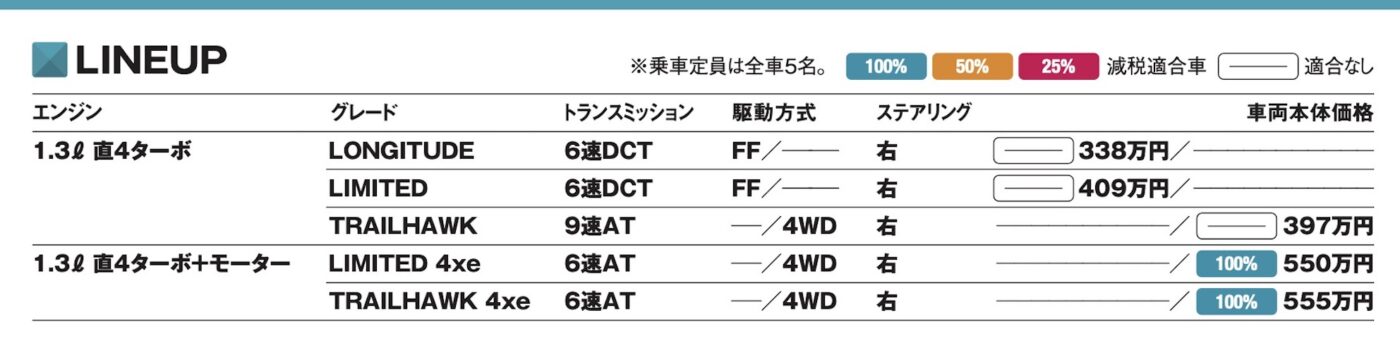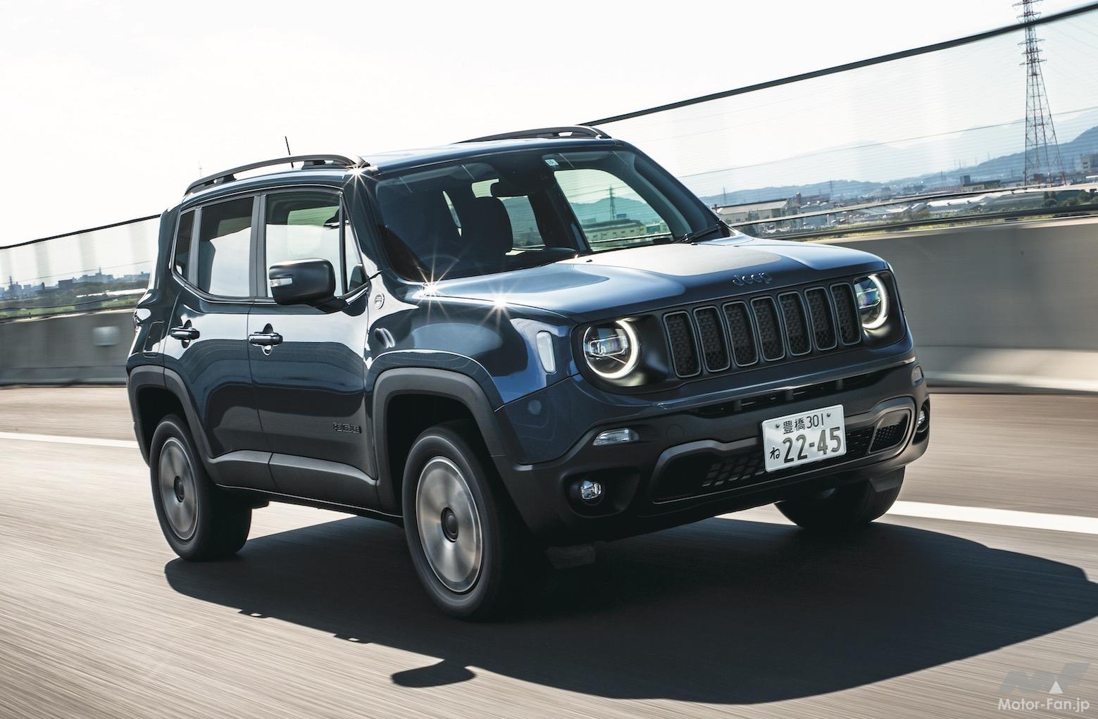 BセグメントのSUVボディに伝統の丸型ヘッドライトと7スロットグリルを備えた、一番小さなジープである「レネゲード」。そのバリエーションは1.3l直列4気筒マルチエアターボを軸に展開しており、ガソリン車はFFと4WDをラインナップ。さらにこの1.3lターボにスタータージェネレーターとリヤモーターを組み合わせたプラグインハイブリッド(PHEV)の「4xe」が昨年上陸した。