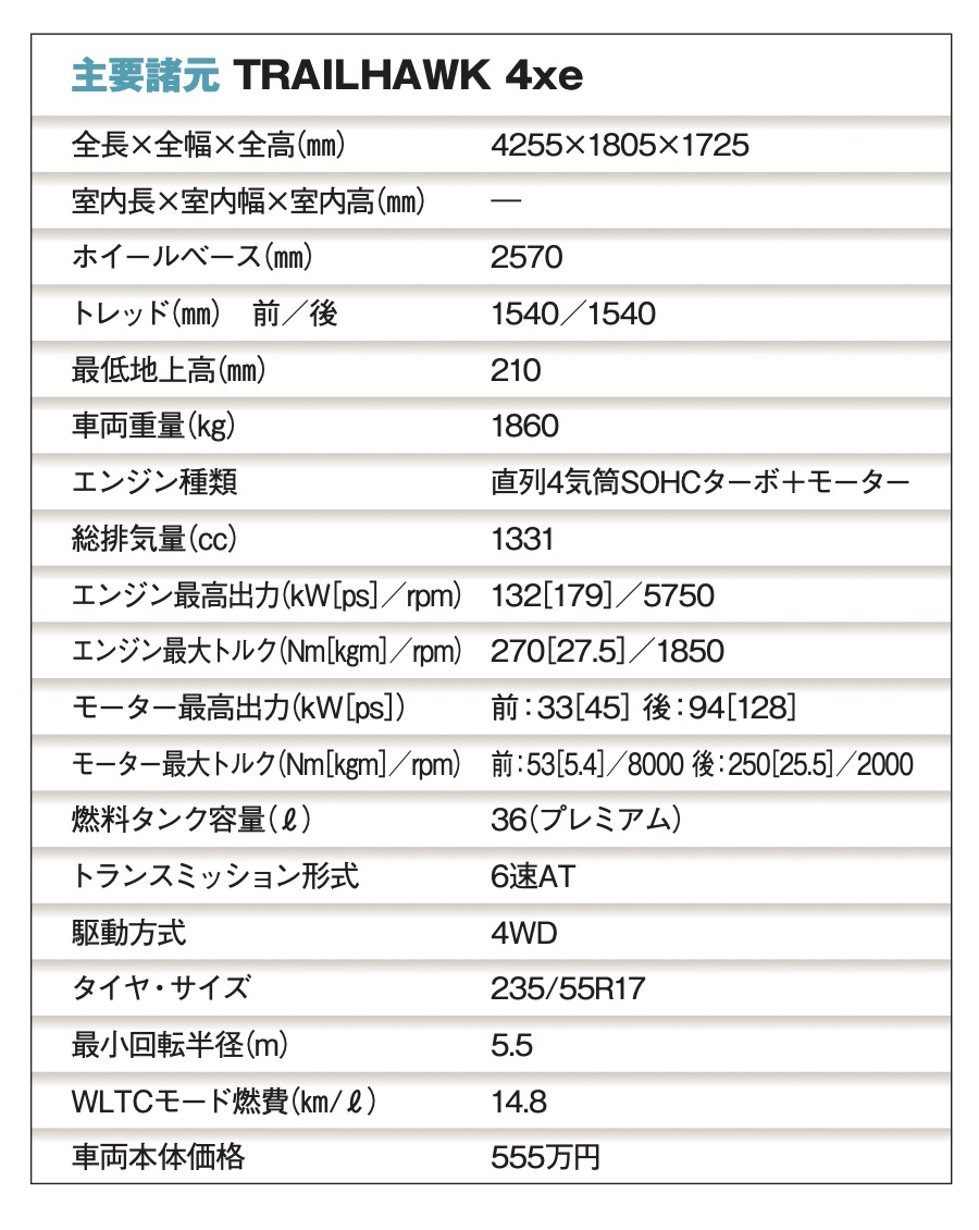 「4xe」はモーター駆動のもたらす滑らかな乗り味がジープとしてはとても新鮮で、かつ雪道や悪路ではその緻密な制御を確実に体感できる。エンジン出力が179psの「トレイルホーク」は131psの「リミテッド」より 70kgほど車重が重いが、前後モーターの定格出力は同じなため、加速性能に大差はない。よってドライブセレクトが欲しいか否かで選べば良いだろう。