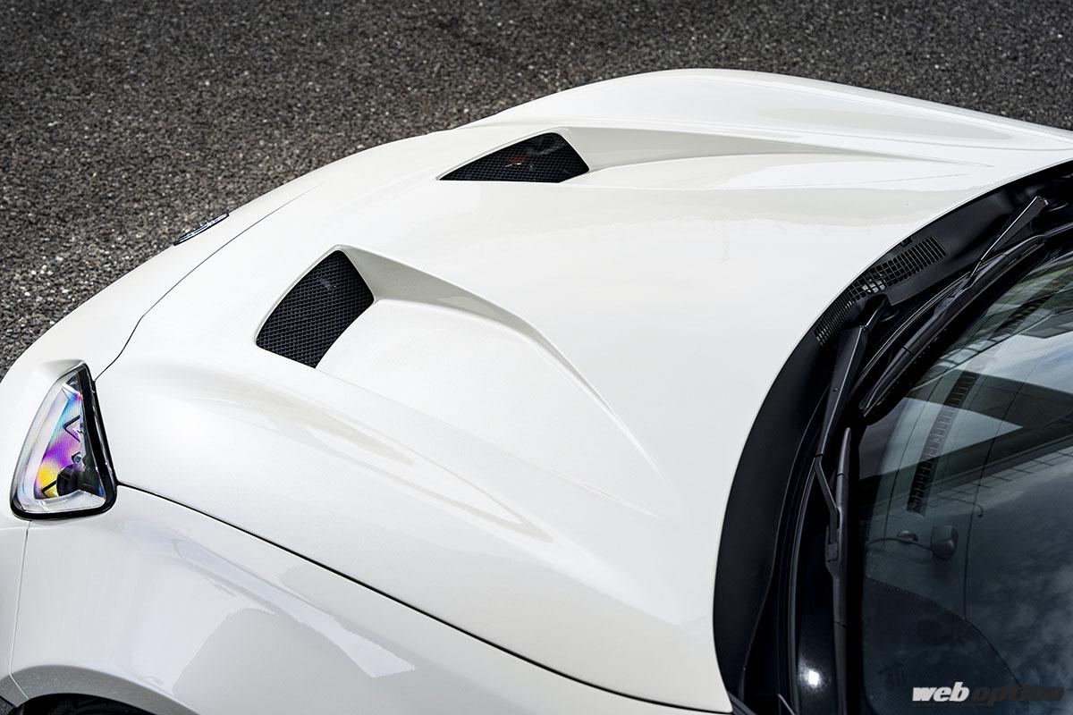 有機的な美しいラインを描くボンネット(FRP:17万6000円/ウェットカーボン:24万2000円)は、ボルテックスのエアロテクノロジーを元に大型アウトレットダクトを配置。エンジンルーム内のヒートエアを効率的に排出してくれる。