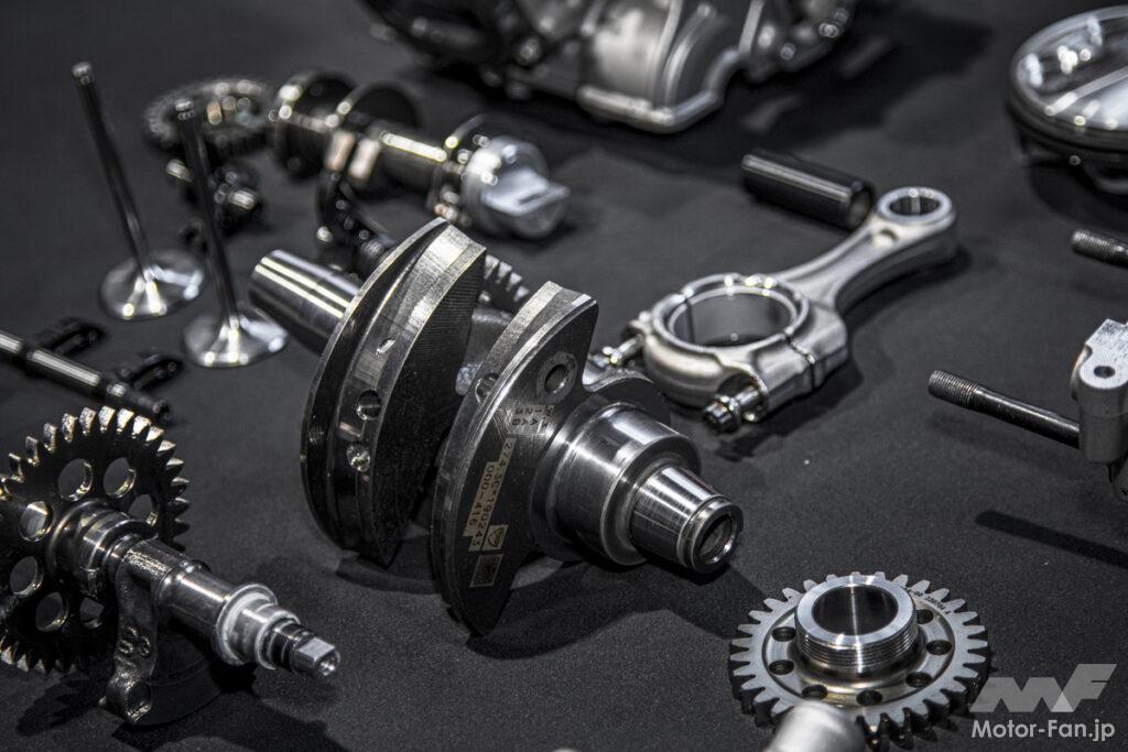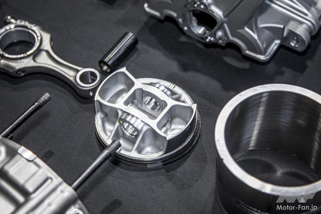 その特徴とは「回転数」。レッドゾーンが1万250回転からに設定されている高回転型エンジンとなっている。この回転数が実現できた理由は、「スーパークワドロ」に倣うビッグボア・ショートストローク構造をしているためだ。「スーパークワドロモノ」は、ボア116×ストローク62.4mmに設定されてる。ボア径はそのまま引き継ぎ、ストローク長を1.6mmだけ延長したのみの仕様をとった。そのため、単気筒でも稀に見る回転数を実現できている。