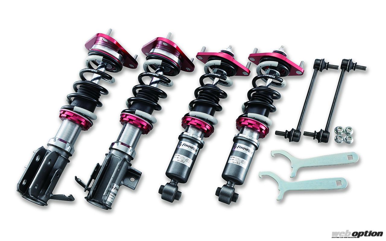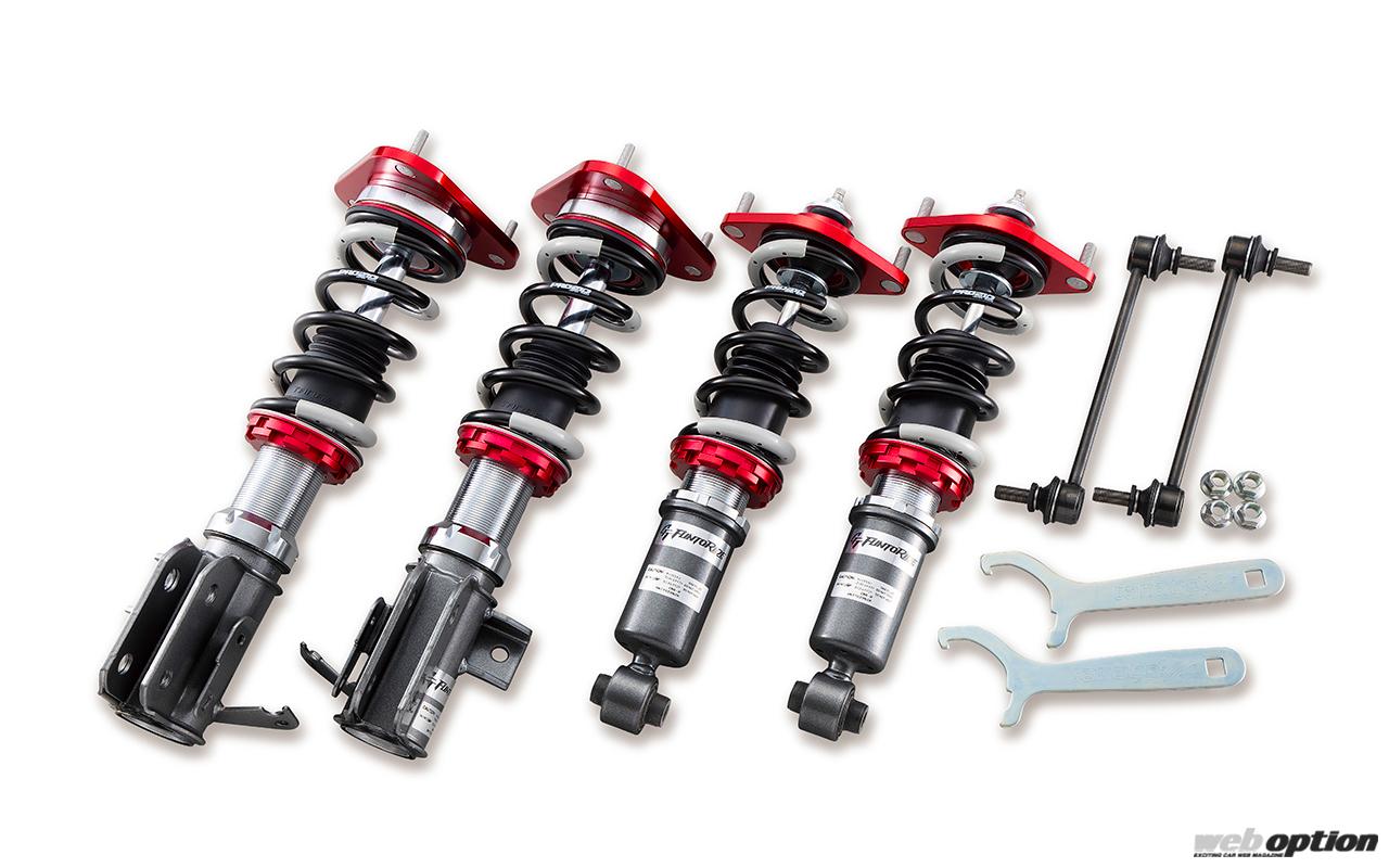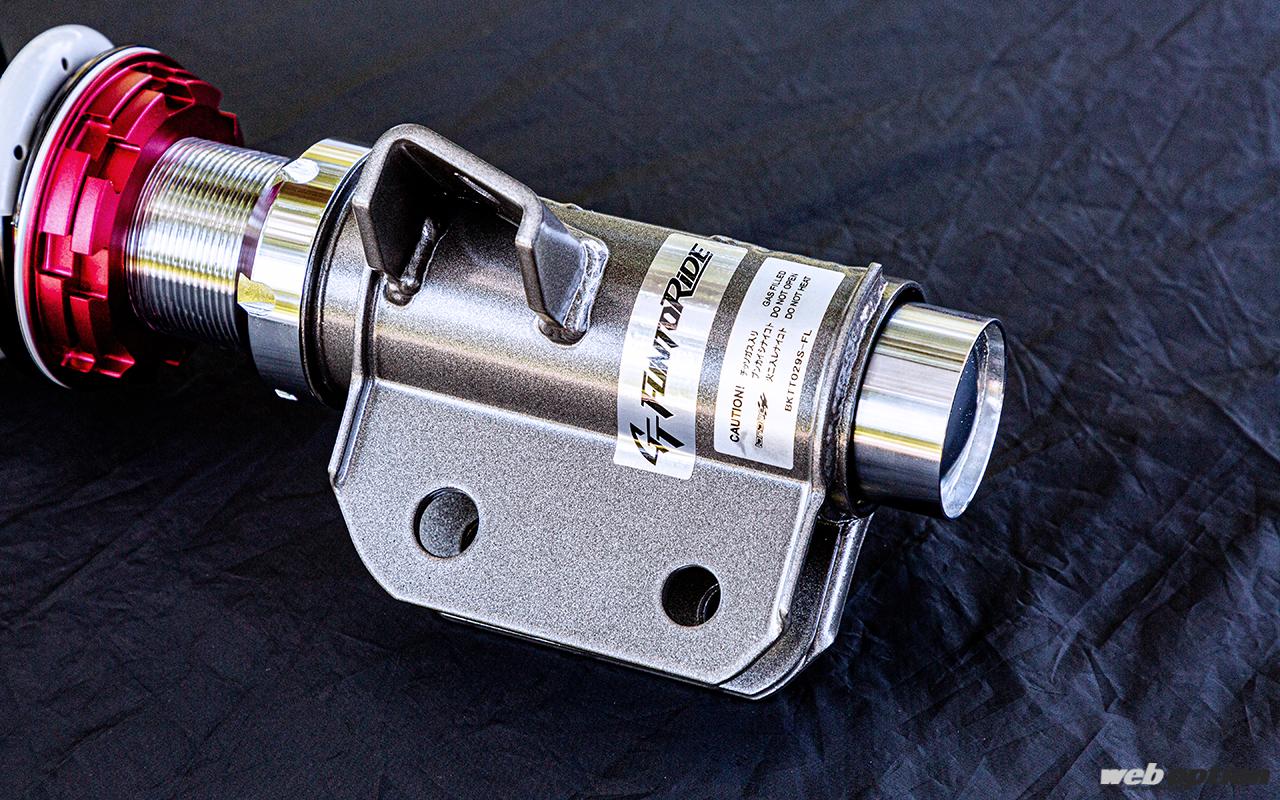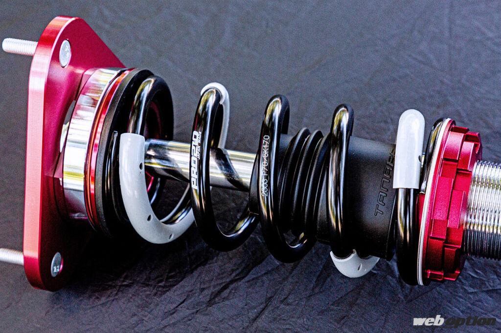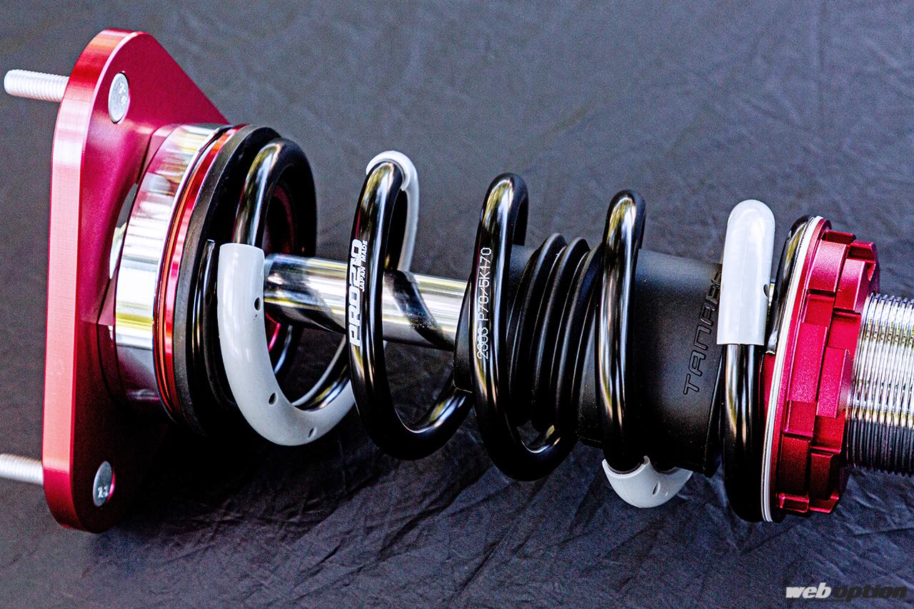 車高調整機能はストロークを維持したまま車高が変えられる全長調整式を採用。スプリングは引っ張り強度2100N/mm2を誇り、軽量化と高耐久性を実現する。GR86/BRZ用のバネレートは前後とも5kg/mmの設定だ。