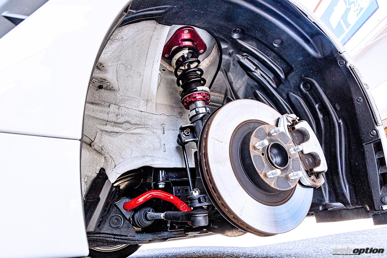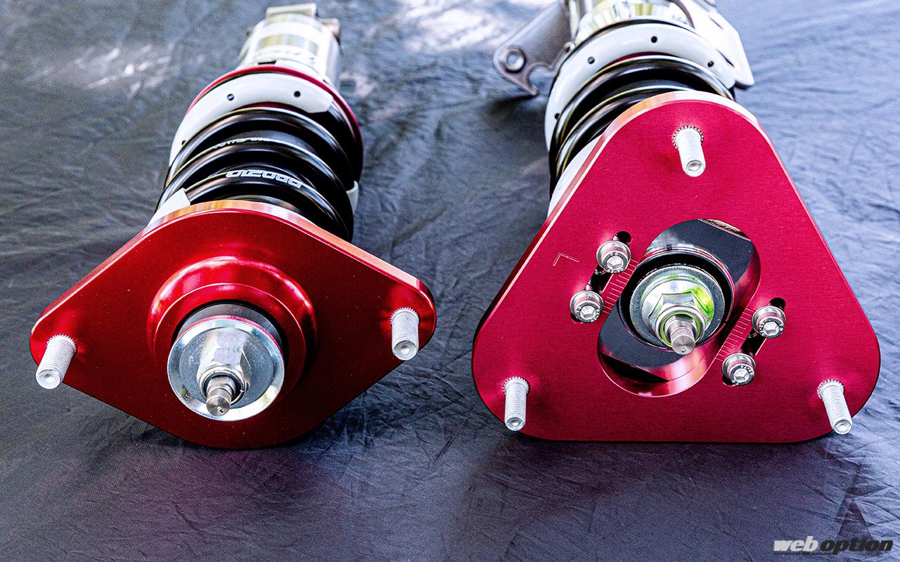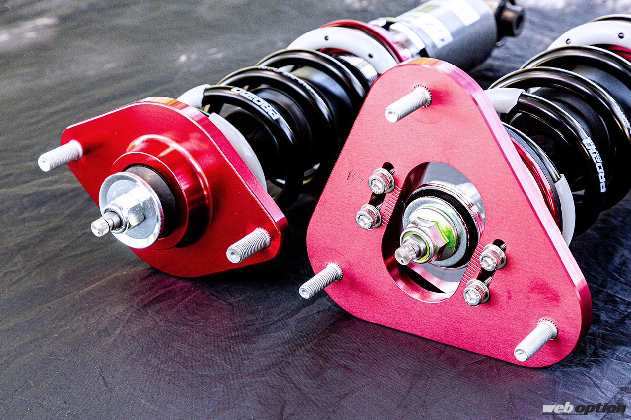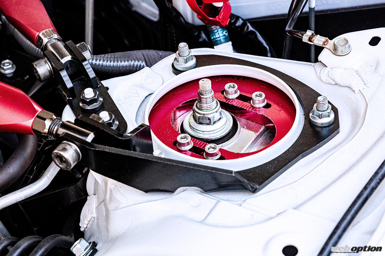 アッパーマウントは不快な異音の発生がなく、静粛性や快適性に優れた専用ゴムブッシュタイプを採用。フロントはキャンバー調整機能付きとして、車高に合わせた細かなセッティングを可能としている。