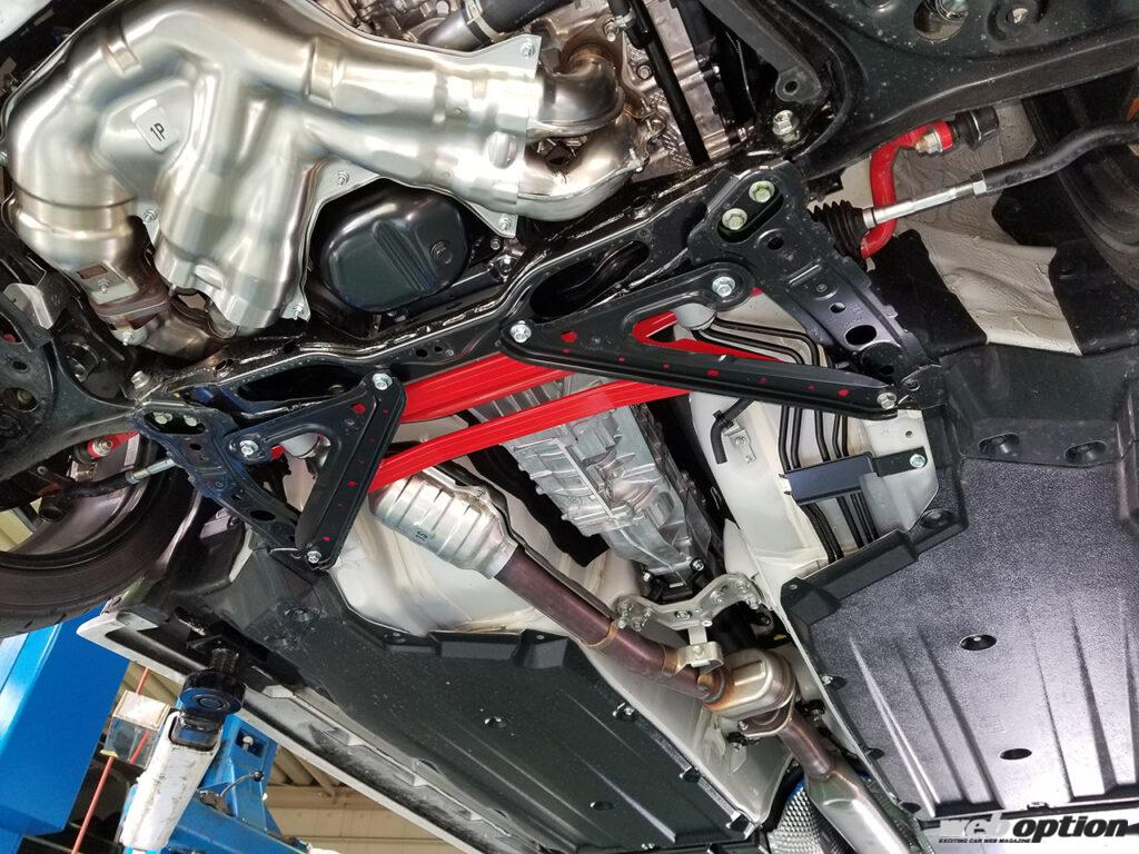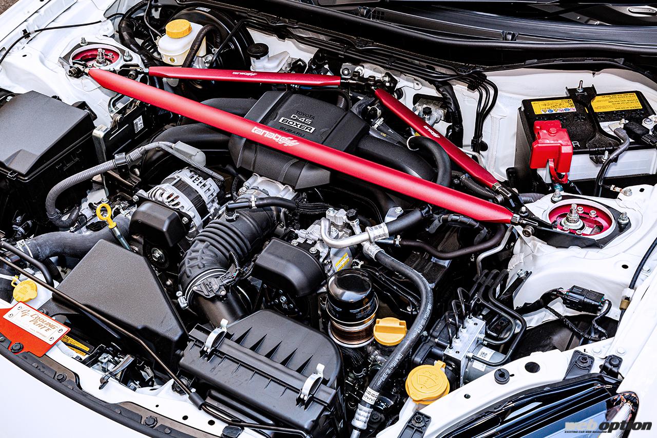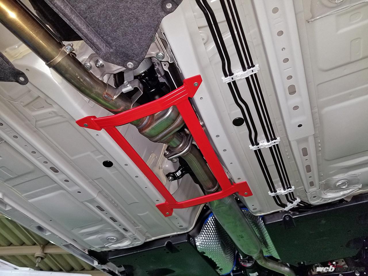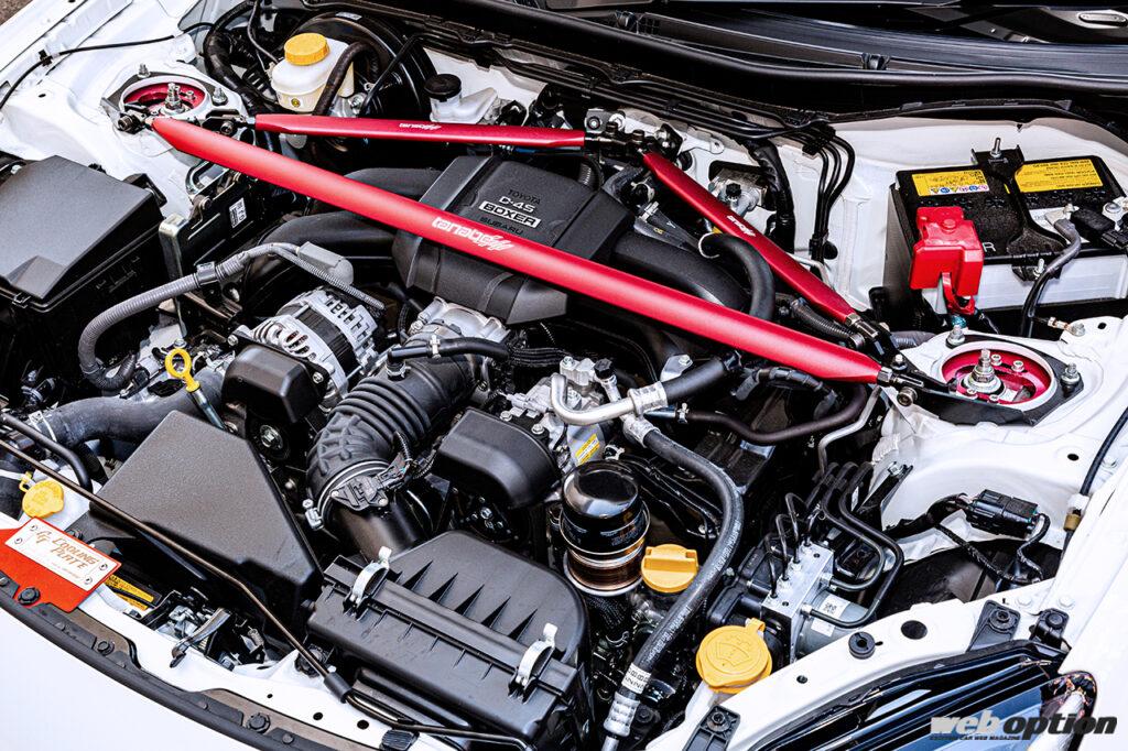 この他、テスト車両のGR86には前後の強化スタビライザーや、ボディ補強パーツのアンダーブレースとストラットタワーバープラスも装着。リヤのストラットタワーバープラスはクリックリリースレバーの導入により、簡単にバーを脱着できるのもポイントだ。