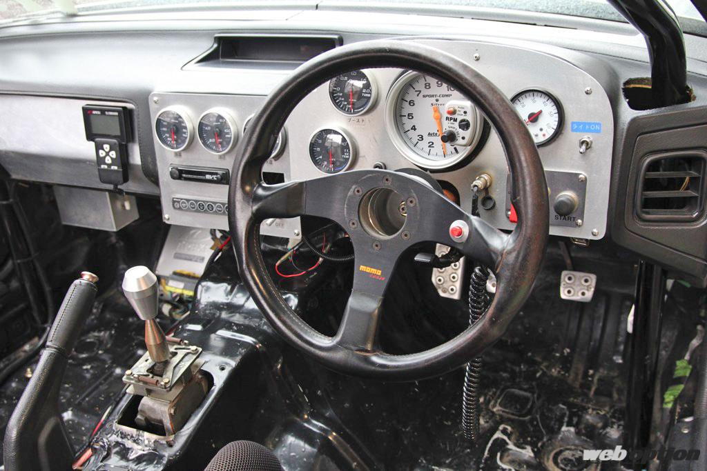 コクピットはスパルタンの一言。中央のオートメーター製5インチタコメーターを始め、各種メーターやスタータースイッチ、燃料ポンプや電動ファンのON/OFF、EVCなどを配置。ステアリングに取り付けられたスイッチはラインロック用だ。アルミの美しいインパネは、オーナー自らが製作したスペシャルだ。