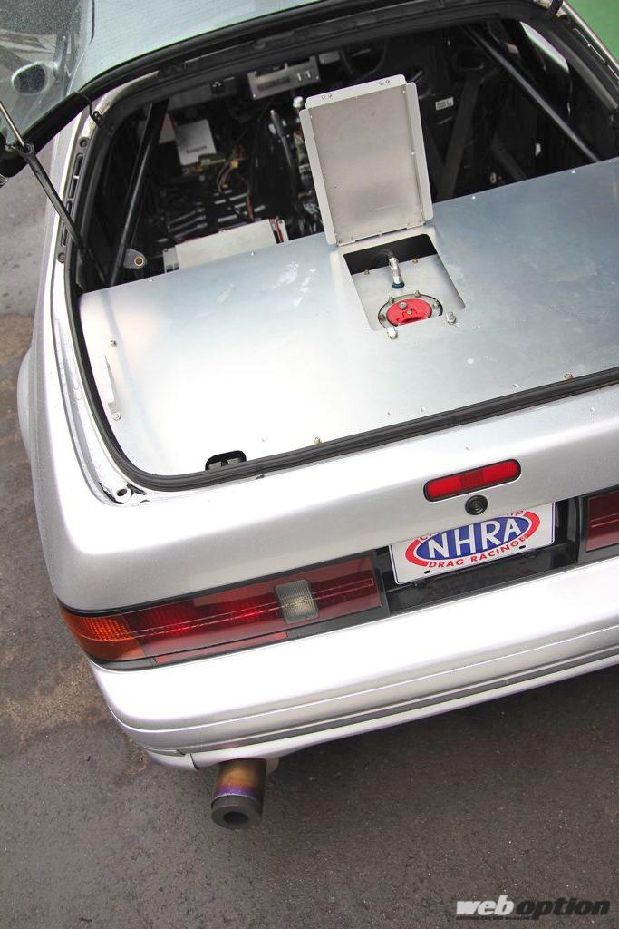 足回りはHKSハイパーマックスDRAGを軸にセットアップ。トラクションの要となるリヤタイヤは、フェンダーを叩き出し加工した上でフージャーDOTドラッグラジアル(275/40-17)を組み合わせている。