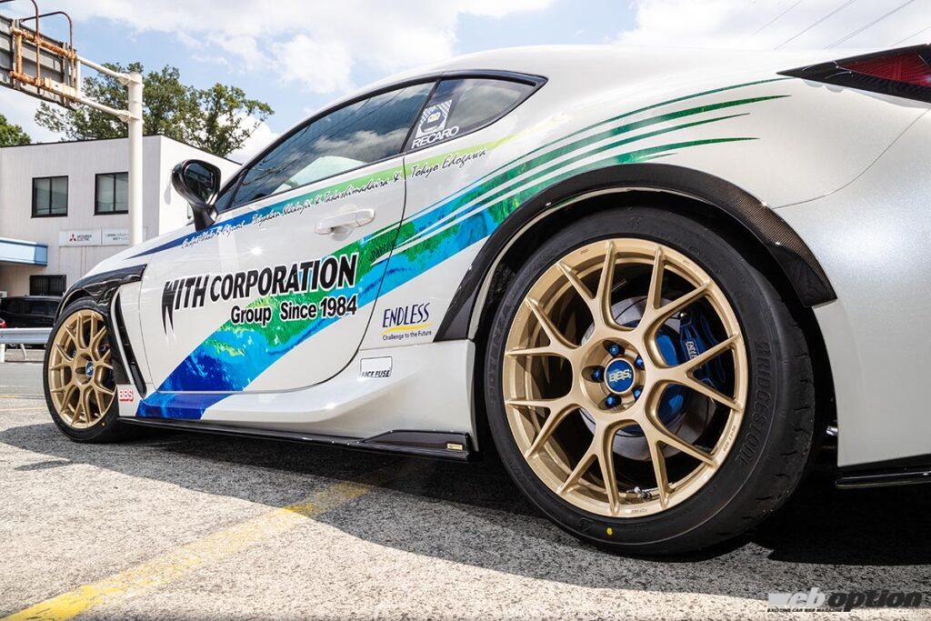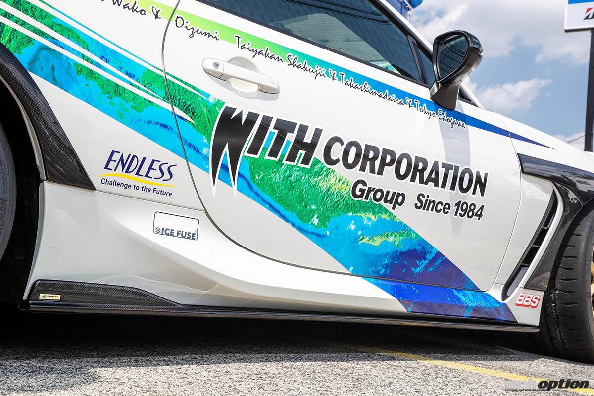 サイドアンダースポイラー(FRP:8万8000円/カーボン:17万3800円)はフロントからボディサイドを流れる空気を整流し、走行安定性を高める本気パーツ。リヤタイヤの前側部分にはフィンが追加されており、ここにもウィズコーポレーションのエンブレムが埋め込まれている。